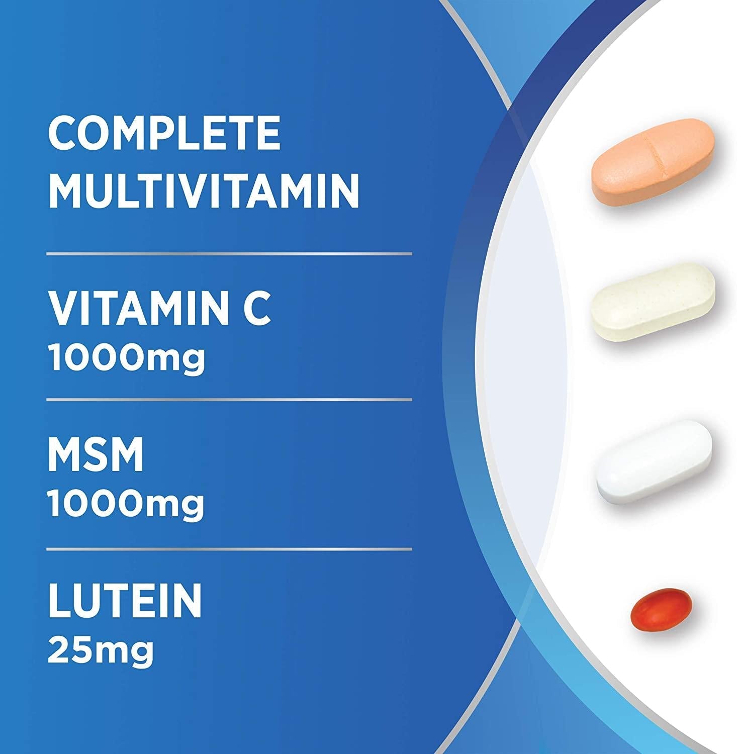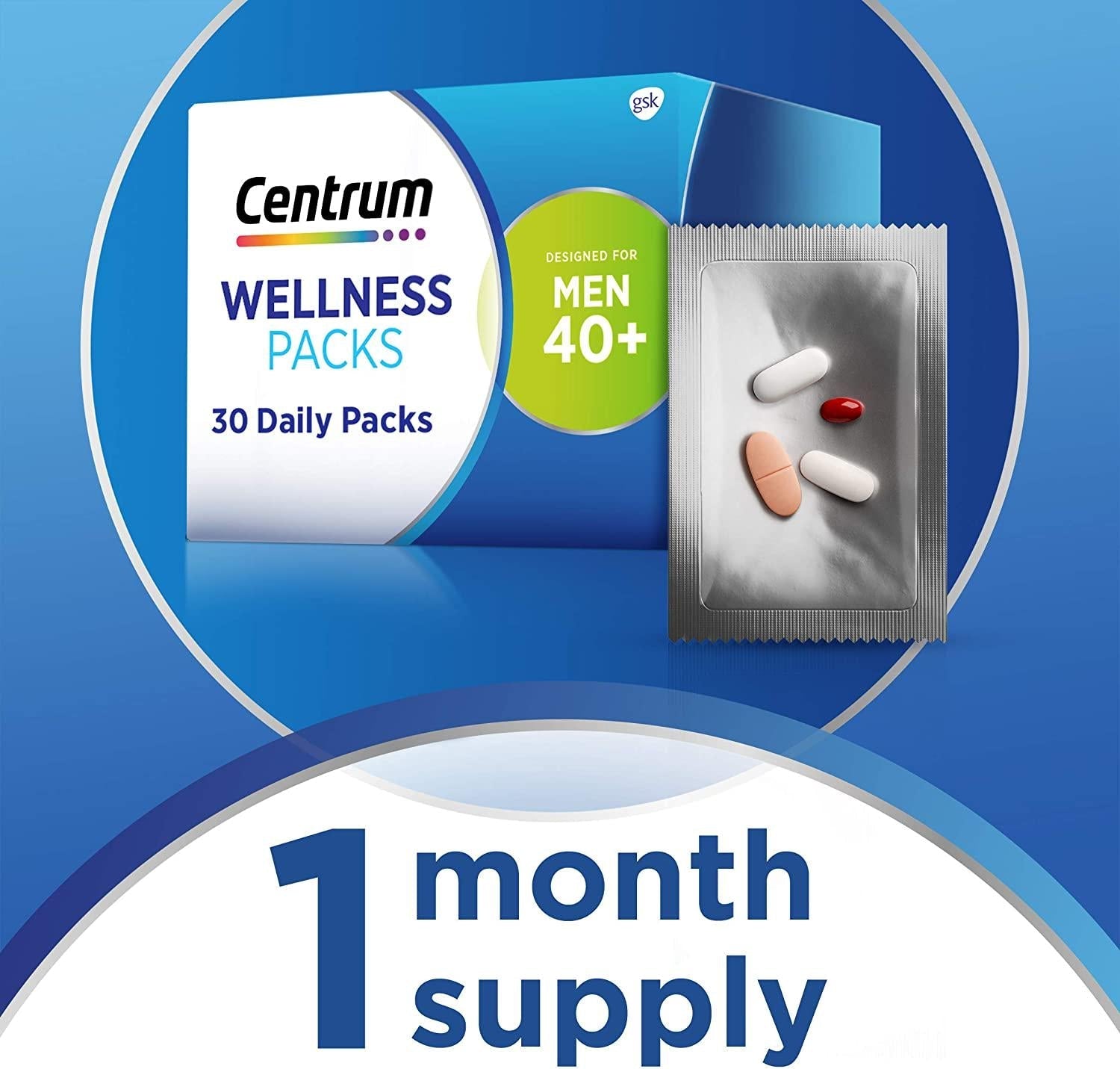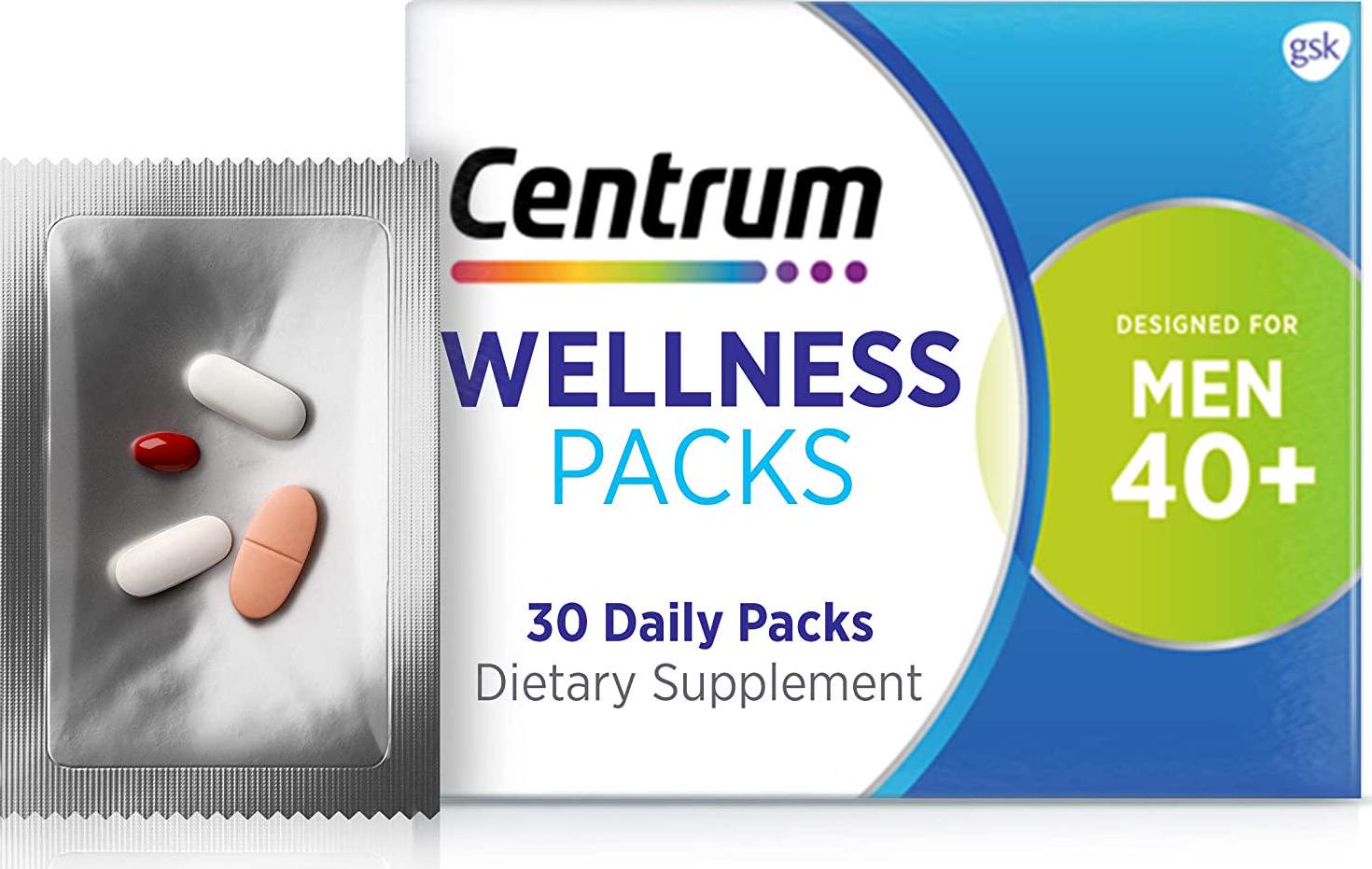 Centrum Wellness packs are daily vitamins for men in their 40s. These men's vitamins and supplements include a complete multivitamin plus three additional supplements that are scientifically Selected by the experts at Centrum to support eye health), muscle health) and the immune system.(1)(9) each Pack of these men's supplements contains a complete multivitamin to support muscle function) and immune health.(1)(9) a lutein supplement with lutein 25mg Supports eye health) and an MSM supplement provides MSM 1000mg, an organic element that is naturally present in the connective tissues and cartilage. A vitamin C supplement with Vitamin C 1000mg provides immune support.(9) These men's daily multivitamin and eye health Supplements provide one month's supply and are easy to carry and store. As the 1 doctor rmmended multivitamin brand, Centrum Vitamins and supplements are backed by over 40 years of nutritional science. Satisfaction tee If for any reason you are not satisfied with any gsk consumer healthcare product, gsk consumer healthcare will provide you with a sement within 45 days of the date of purchase. Please note that because gsk is unable to control the quality of our products sold by unauthorized sellers, the tee is not available for products purchased from unauthorized sellers due to potential quality issues outside gsk's control. Please gsk consumer healthcare directly for more information.