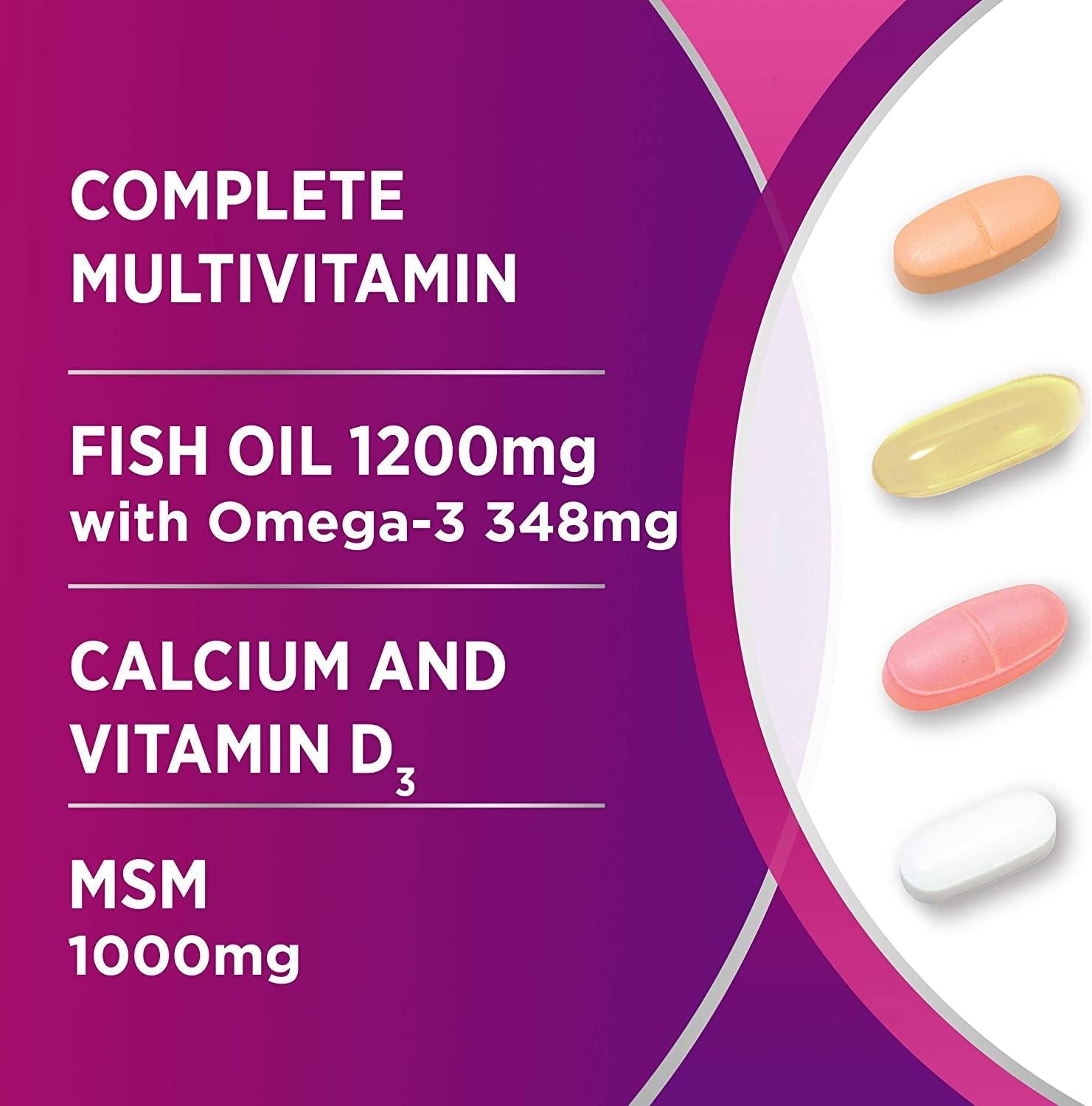 - 30 packs/1 month supply of Centrum Wellness packs daily vitamins for women in their 60s, Women's vitamins with complete MULTIVITAMIN, calcium carbonate 600mg, fish oil with Omega 3, and MSM 1000 mg
