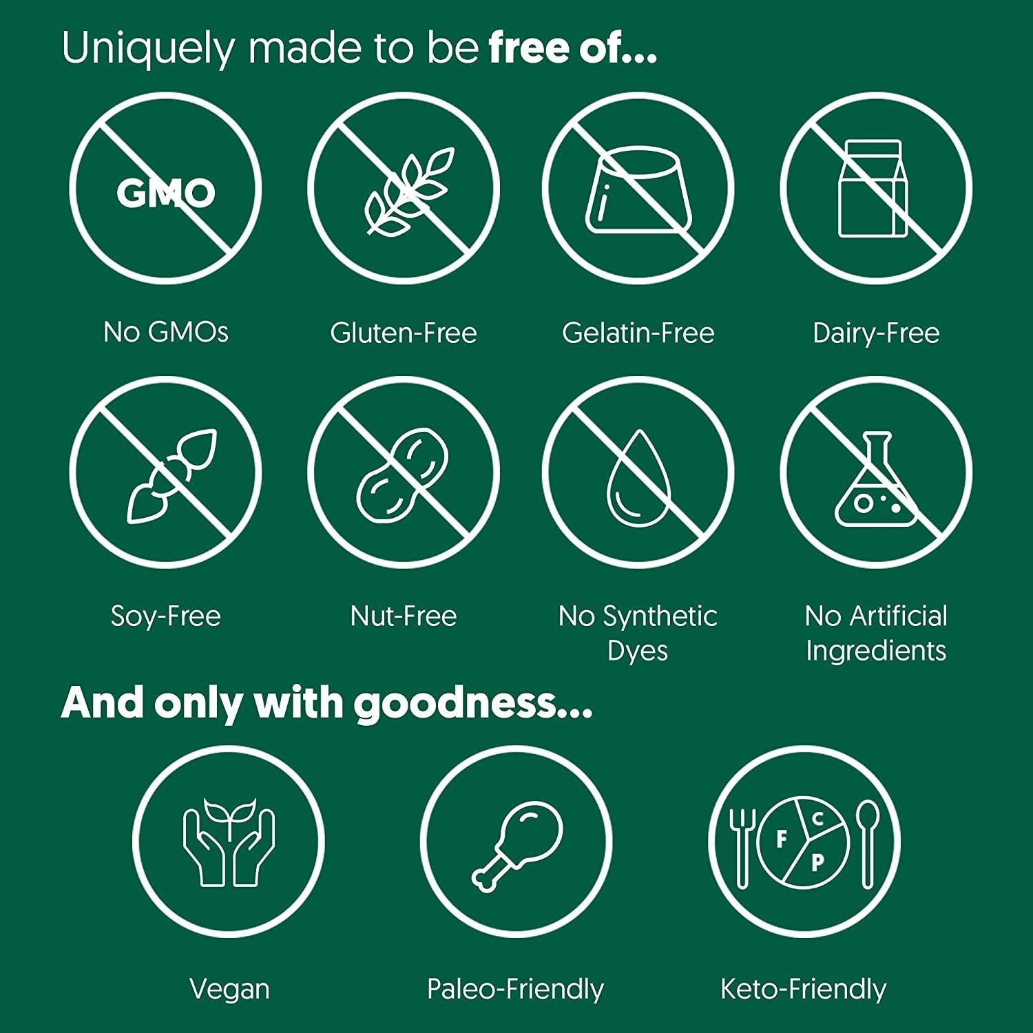 - Vegetarian, keto, and paleo friendly. Does NOT contain GMOs, gluten, gelatin, dairy, soy, nuts, synthetic dyes, or artificial preservatives.