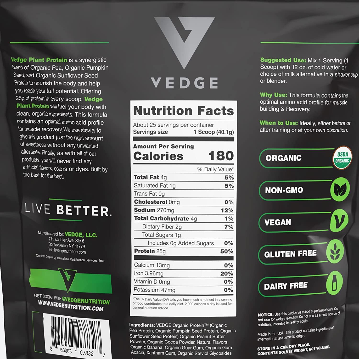 - CERTIFIED ORGANIC: Vedge Plant Based Protein is USDA Certified Organic, non GMO, Vegan certified, gluten free, dairy free, soy free, and No artificial flavors, colors or sweeteners