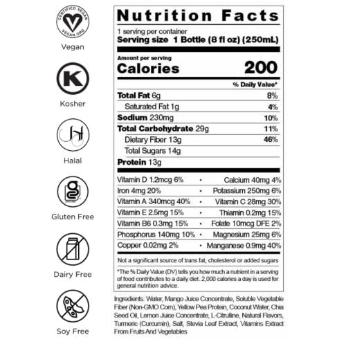 13g protein, dairy free, mango peach flavor, plant based protein shake, ready to drink, usa, vegan