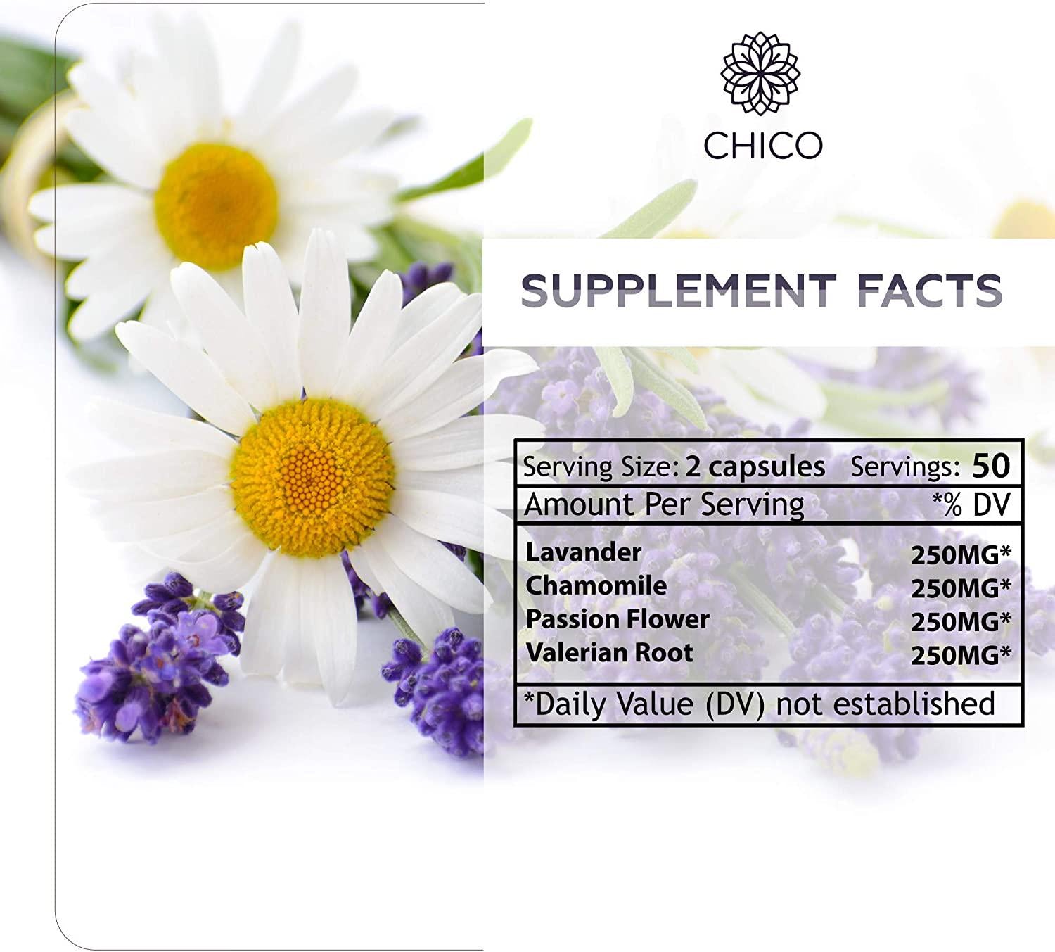 CHICO Sleep Aid Herbal Complex - Natural Supplement Formula with Lavender, Chamomile, Passionflower, Valerian Root - Promotes Deep and Restful Sleep, Calm Mood and Stress Relief - 100 Vegan Capsules