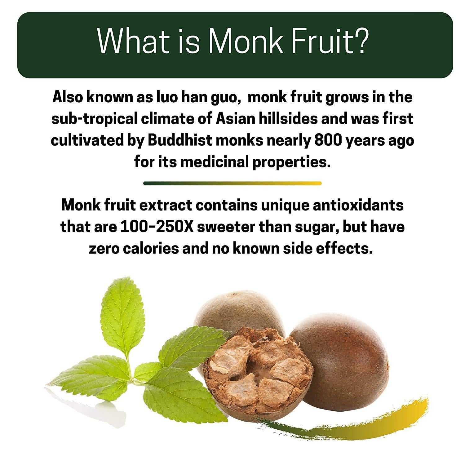 - SWEETENED WITH MONK FRUIT & ALLULOSE: We found the winning combination for a magically sweet, low calorie, natural sugar substitute: monk fruit blended with allulose sweetener. Monk fruit sweetener is rich in antioxidants, sweeter than sugar, but contains zero calories. Allulose, which is an ingredient found naturally in foods raisins, figs and maple syrup, contains only one-tenth of the calories of table sugar yet is sweet in taste and has no impact on blood glucose levels