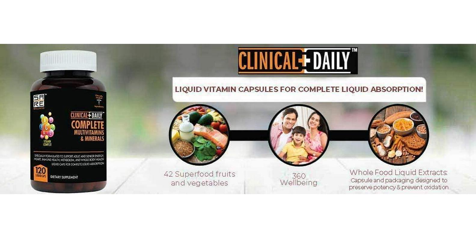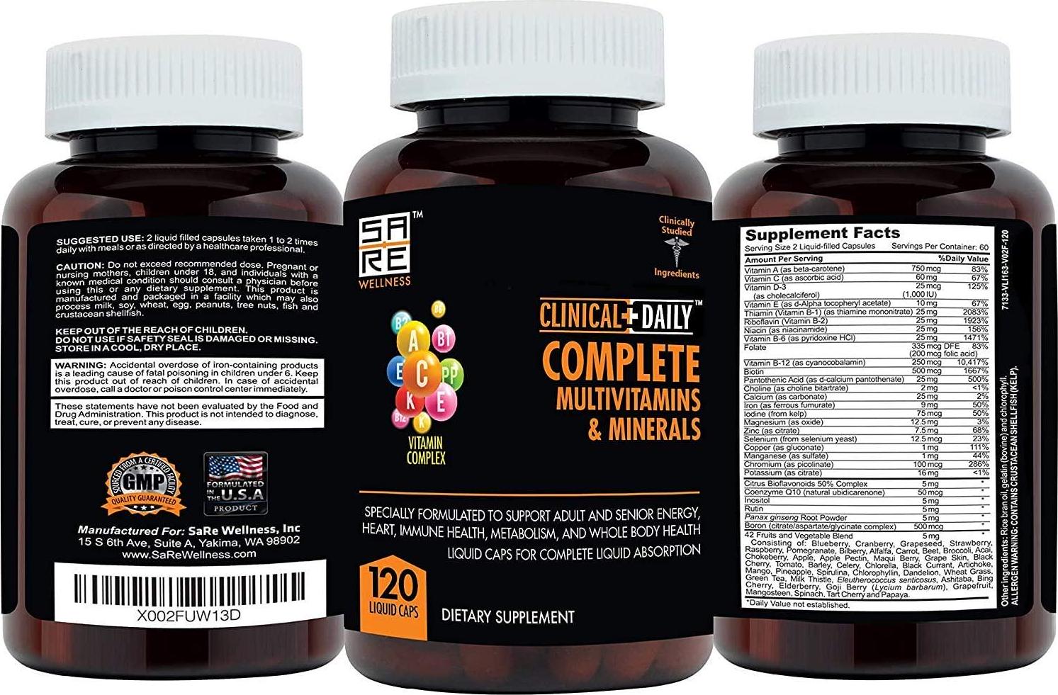 CLINICAL DAILY COMPLETE ADULT AND SENIOR MULTIVITAMINS. Liquid Multivitamins for Women and Men in 120 Liquid Cap Pills for complete liquid absorption. 42 fruits and vegetables blend support energy, vision, immunity, nervous, brain and heart care. No matter your age or lifestyle, this is the most COMPLETE multivitamin complex for you! A complete senior multivitamin, a complete women's multivitamin, a complete men's multivitamin. Advanced soluble nutrient formula designed for excellent absorption, helps support better vitality plus close dietary needs not met by meals. This supports enhanced benefit from an overall increase in bioavailable nutrients.