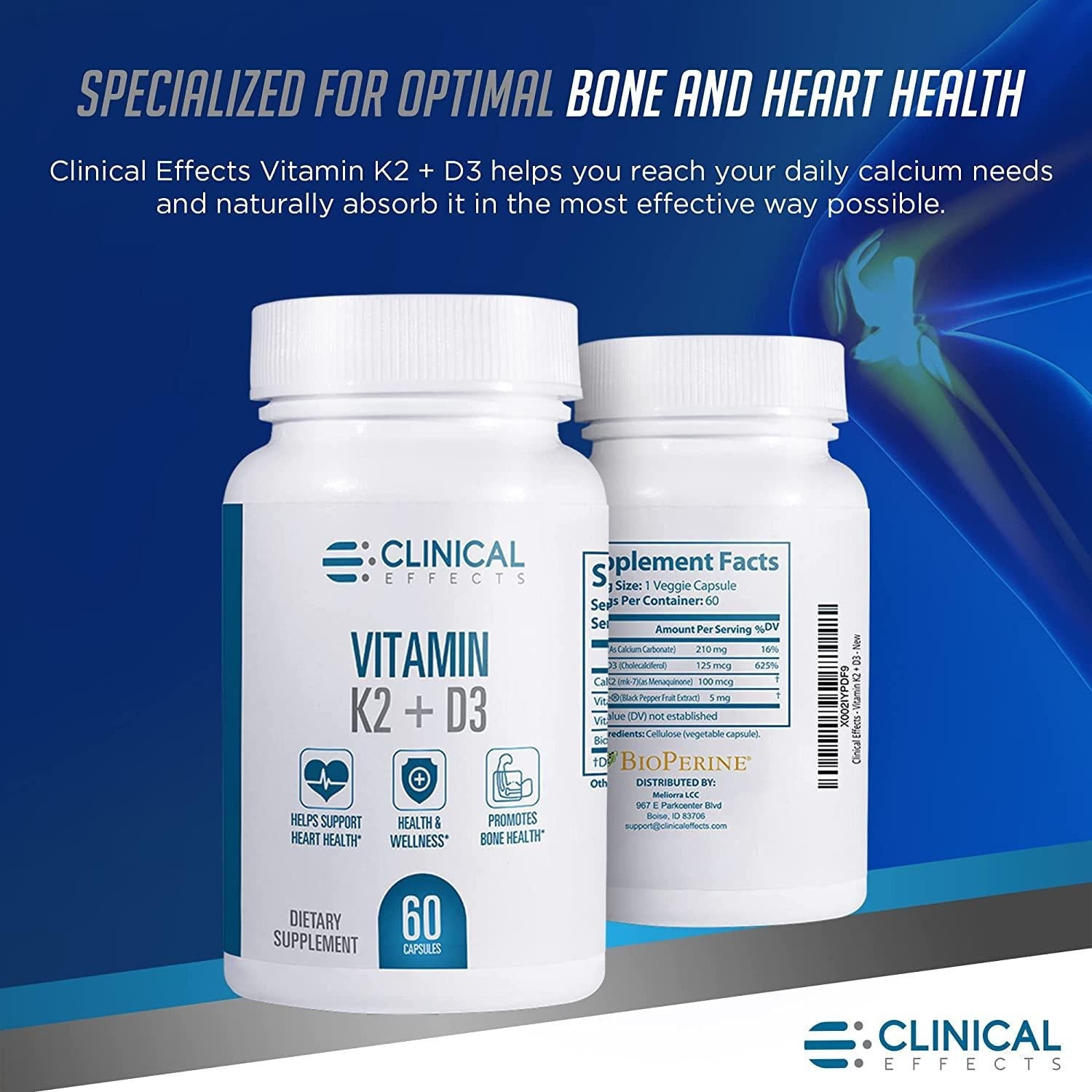 - OPTIMIZED FORMULA FOR BONE HEALTH: Clinical Effects Vitamin K2 + D3 is formulated specifically to help promote strong bones by supplementing your daily calcium needs and naturally assisting your body in absorbing it at the same time.