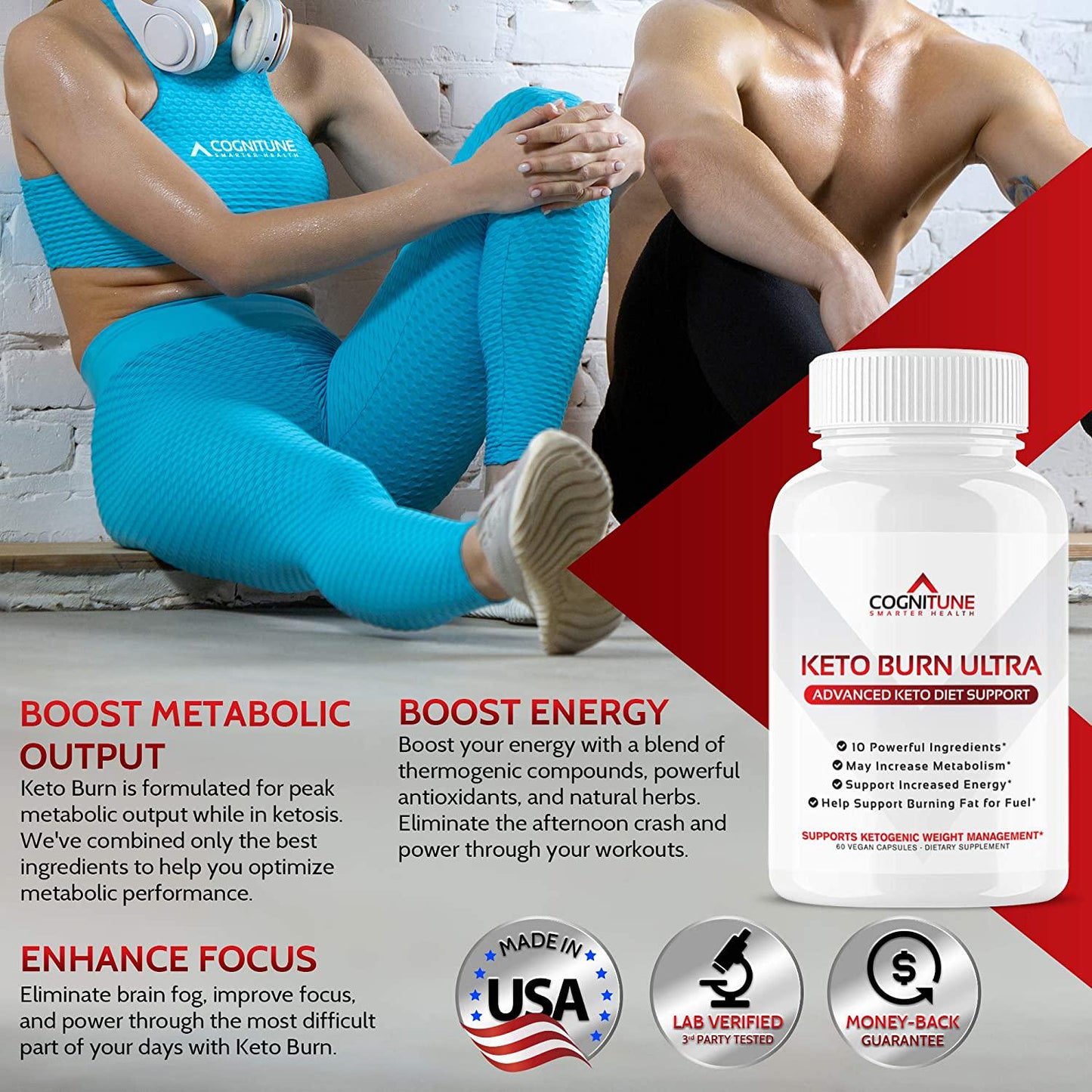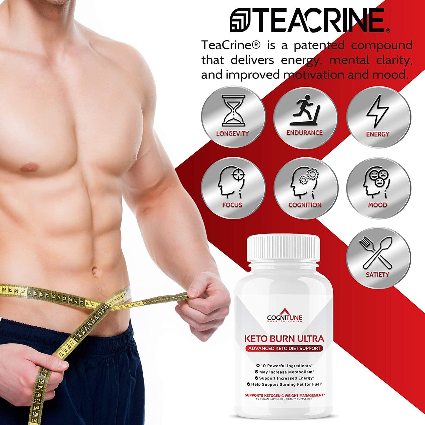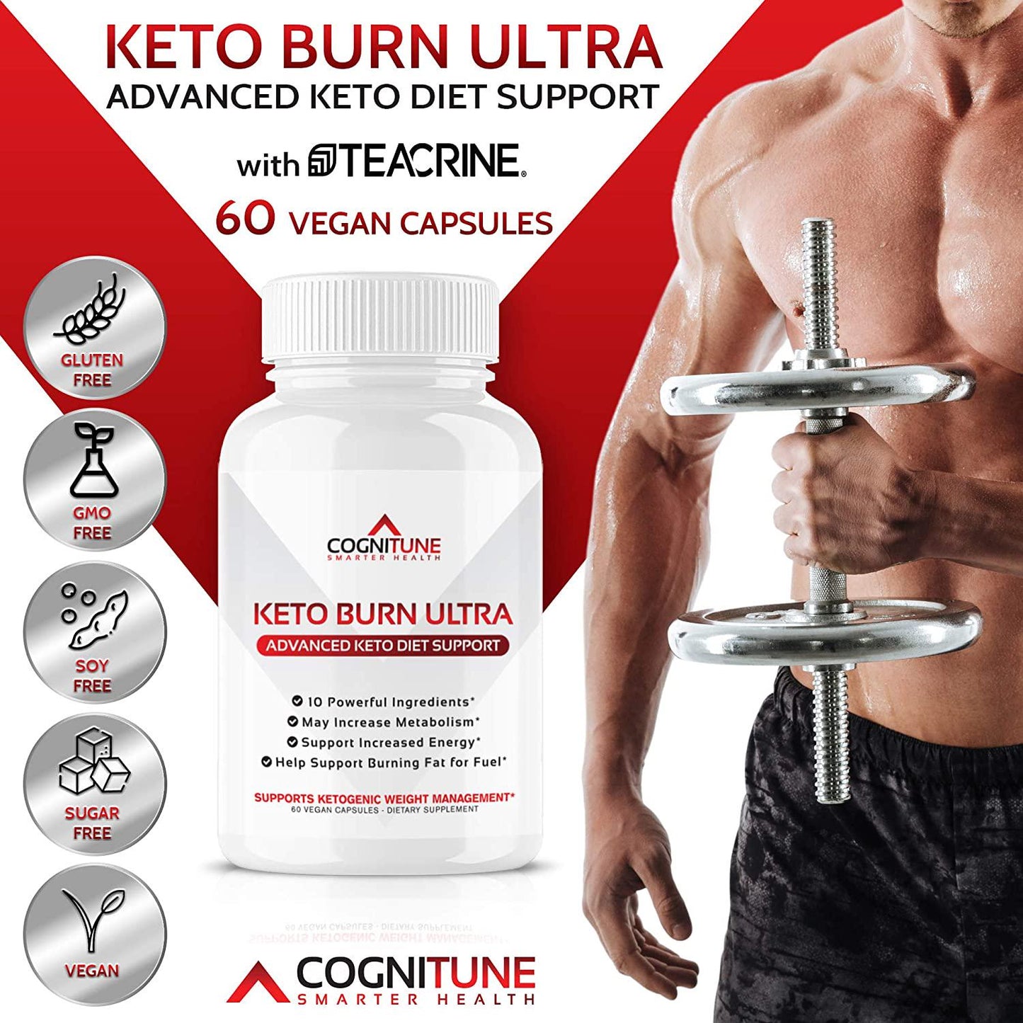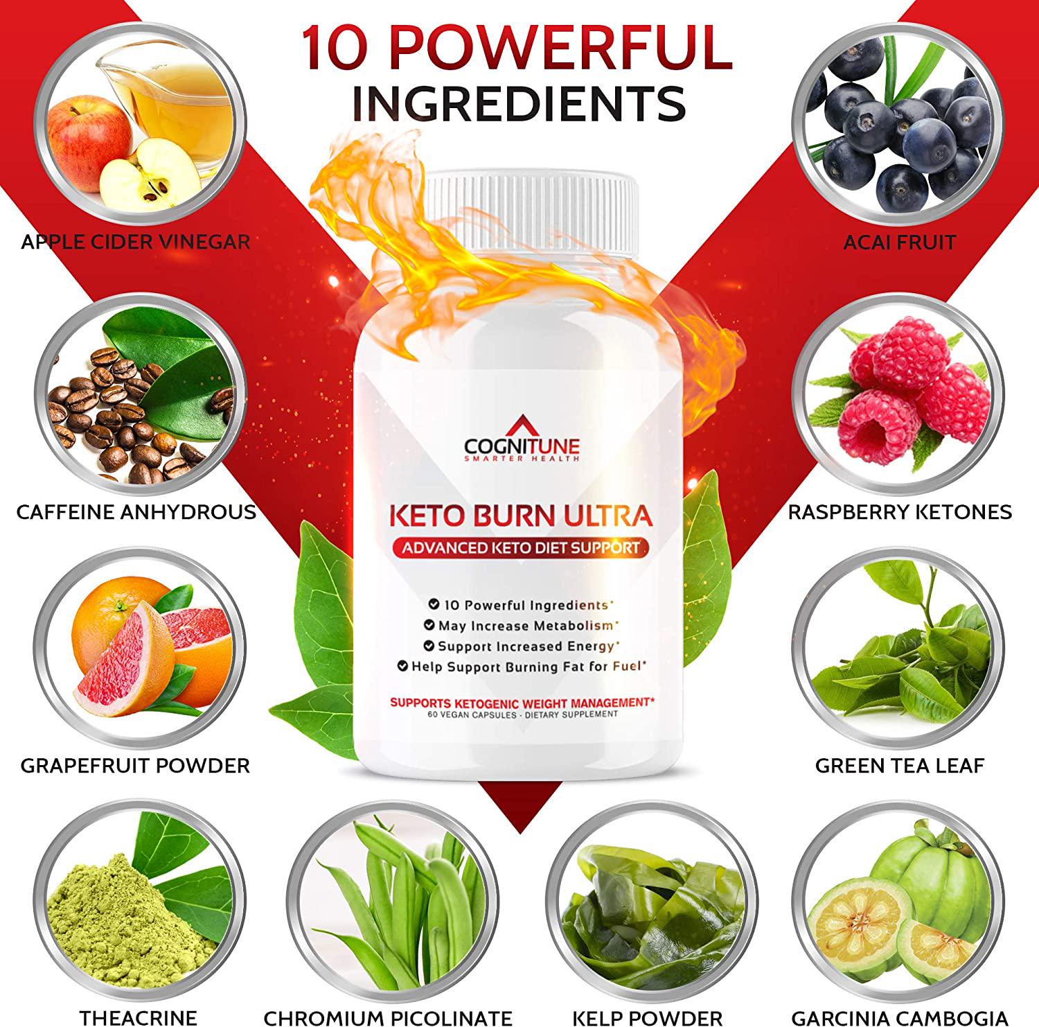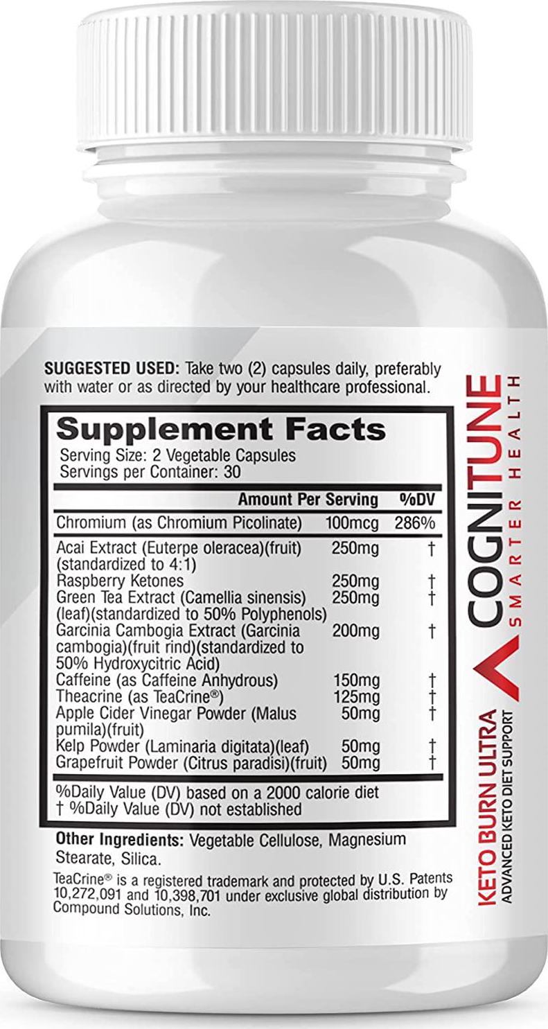 The Ultimate Formula for Effective Ketosis Dont settle for low-quality formulas that skimp on key ingredients, forcing you to buy multiple supplements just to see real results. Our research-backed thermogenic formula contains the perfect blend of pure supplements that can help turn fat into fuel and support wellness. POWER UP YOUR DAY WITH KETO BURN ULTRA With 10 Key Supplements Raspberry Ketones, Apple Cider Vinegar, Garcinia Cambogia, and More! Frustrated with other ketosis supplements that dont make any difference to your ketone levels, energy, or weight The largest pain point for keto dieters is maintaining the energy and focus to stay productive throughout the day. At CogniTune, weve specifically formulated our research-backed Keto Burn Ultra with 10 key ingredients that can help manage weight and increase energy, focus, and drive while the body is in ketosis: - Raspberry Ketones (250mg) - Apple Cider Vinegar (50mg) - Garcinia Cambogia (200mg) - TeaCrine (100mg) - Chromium Picolinate (100mcg) - Acai Extract (250mg) - Green Tea Extract (100mg) - Caffeine Anhydrous (150mg) - Kelp Powder (50mg) - Grapefruit Powder (50mg) Experienced allergic reactions or stomach pains with other keto pills Keto Burn Ultra was developed to be especially gentle on the digestive system. Our vegan, keto and paleo-friendly formula contains: - Zero Allergens - Zero Gluten - Zero Soy - Zero GMOs OUR FULL-TRANSPARENCY PROMISE At CogniTune, we believe in full transparency with our customers which is why we list each ingredient separately, without vague proprietary blends. So you get exactly what it says on the bottle, and nothing less. Made in the USA, following strict Good Manufacturing Practice standards.