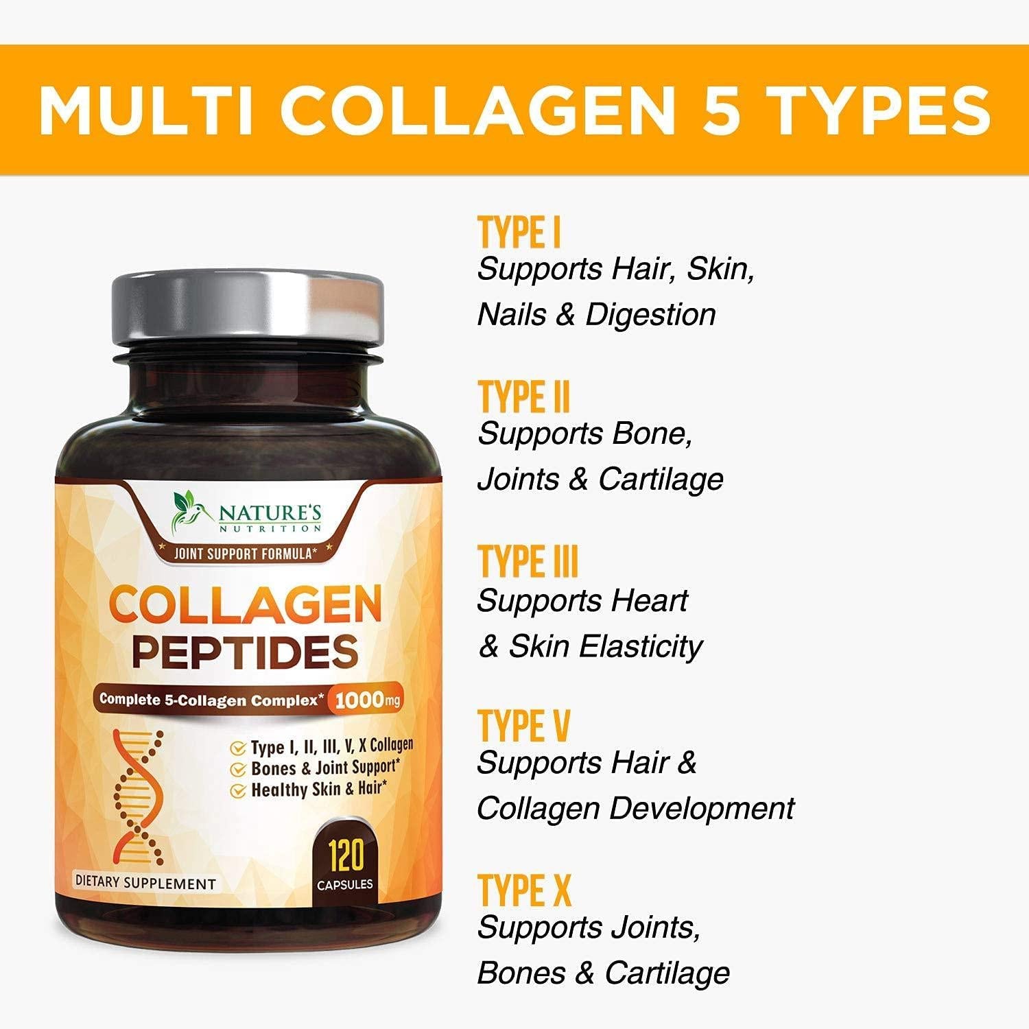 Collagen Peptides Pills 100% Pure Collagen Powder 1000mg - Collagen Powder Type I, II, III, V, X - Boosts Hair, Nails and Skin, Anti Aging Joint Formula, Paleo Friendly, Gluten Free - 120 Capsules