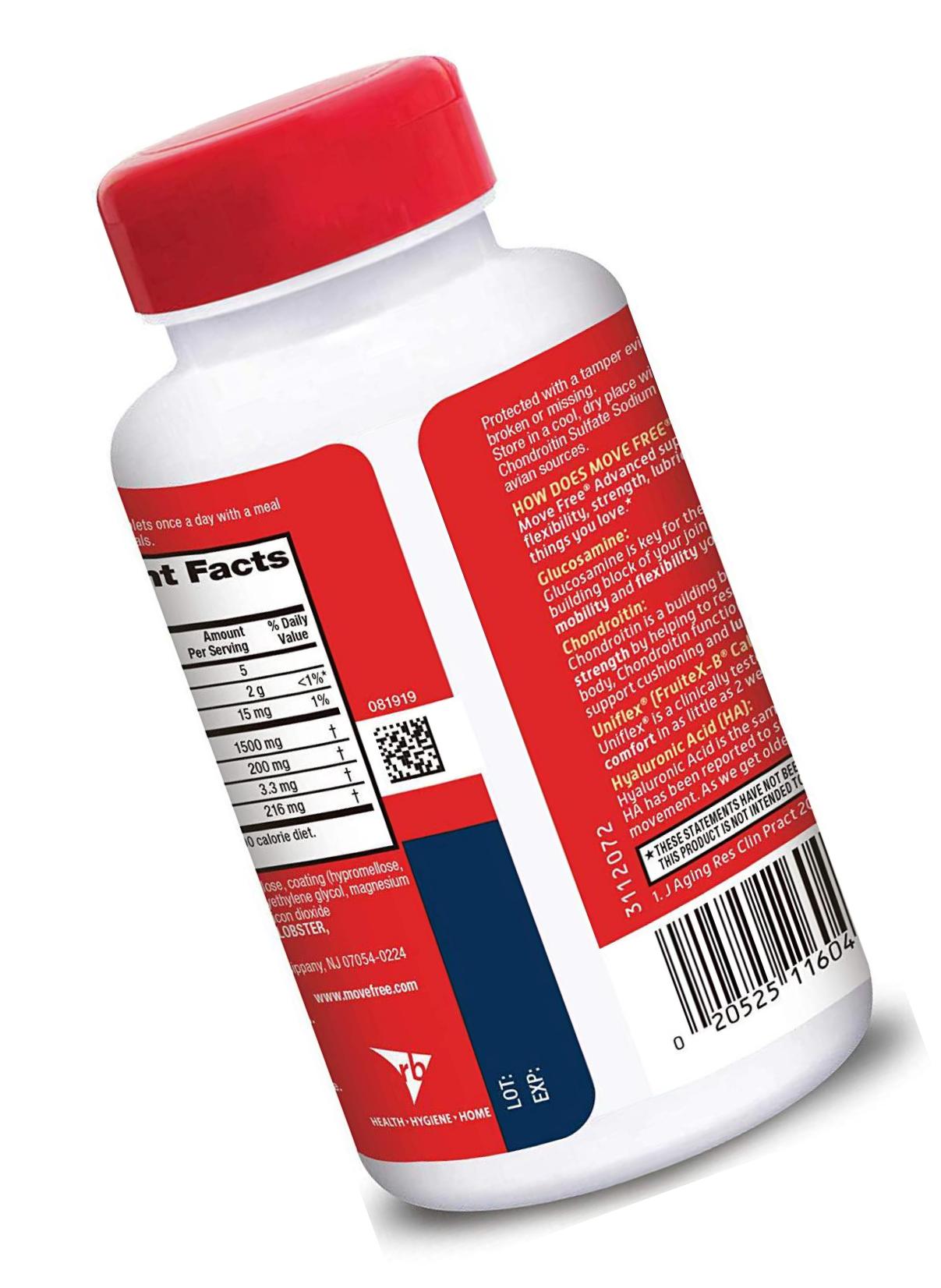 Move Free Advanced is a Glucosamine Chondroitin joint supplement that supports 5 signs of joint health: mobility, flexibility, strength, lubrication and comfort so you can do the things you love. Glucosamine is key for the formation of cartilage, an essential building block of your joints to support your mobility and flexibility. Chondroitin is a building block of cartilage that supports joint strength by helping to resist compression in the joint. In the body, Chondroitin functions by attracting fluid to joints to support cushioning and lubrication. Uniflex (fruitex-b calcium fructoborate) is a clinically tested mineral complex that supports joint comfort in as little as 2 weeks1. Hyaluronic acid (HA) is the same molecule found in healthy joint fluid. Ha has been reported to support joint lubrication and smooth movement. As we get older, levels of HA tend to decrease.