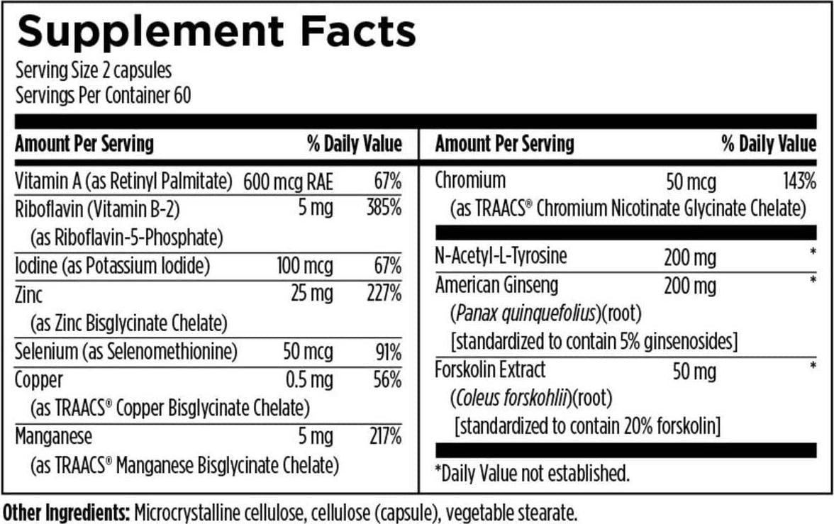 - It'scomprehensive formula with Coleus Forskohlii, Iodine, Tyrosine, Selenium, and the superior chelated form of Copper, Zinc, Manganese and Chromium.*
