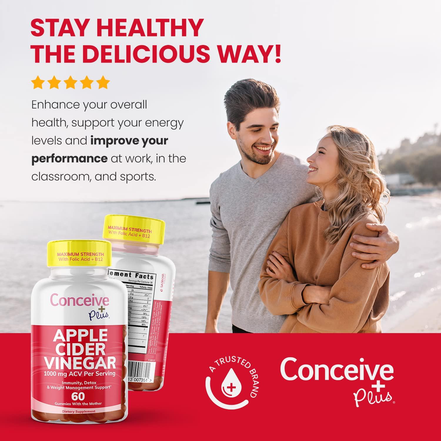 - Great Addition To Any Healthy Diet: The Conceive Plus apple cider vinegar gummy is 100% vegan, non-GMO, gluten-free, gelatine-free, and contains zero synthetic additives, fillers, or preservatives that could cause health risks.