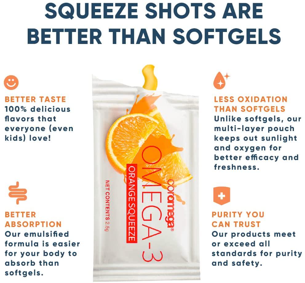 Coromega Omega 3 Fish Oil Supplement, 650mg of Omega-3s with 3X Better Absorption Than Softgels, Orange Flavor, 90 Single Serve Squeeze Packets