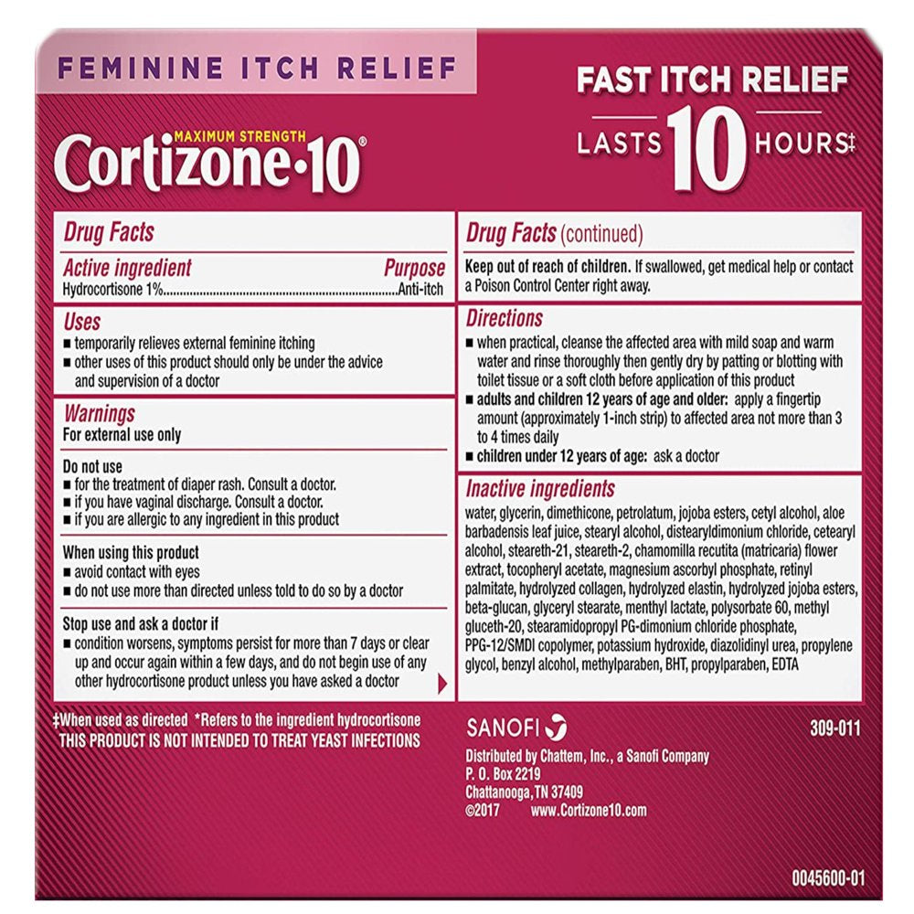 CONTAINS: One (1) 1-oz. tube of Cortizone 10 Maximum Strength Feminine Itch Relief Creme FAST RELIEF: This feminine itch creme relieves itching fast and lasts for hours STOP THE ITCHSANITY: Cortizone 10 Feminine Itch Creme contains maximum strength hydrocortisone, the #1 itch medicine recommended by doctors SENSITIVE SKIN: Maximum Strength Cortizone 10 Feminine Itch Relief Creme is safe for sensitive skin 7 MOISTURIZERS: This anti-itch feminine creme is formulated with hydrocortisone anti-itch medicine, 7 moisturizers, including aloe, plus vitamins A, C & E for soothing relief