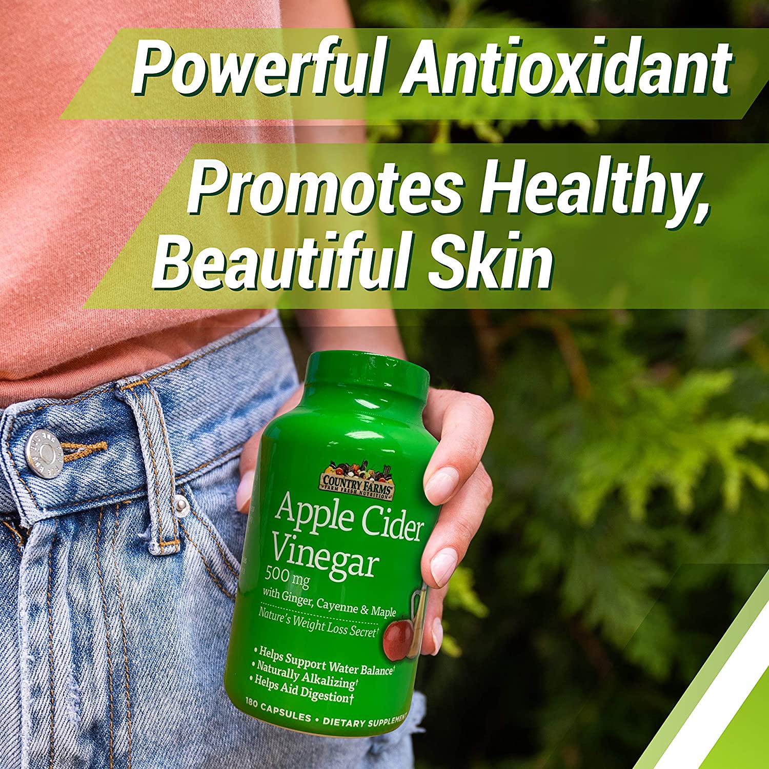 - Pure Apple Cider Vinegar for water balance & Digestive health - each capsule of Country Farms Apple Cider Vinegar provides your body with 500 mg of apple cider and 100 mg of Ginger, cayenne and maple to help promote proper water balance