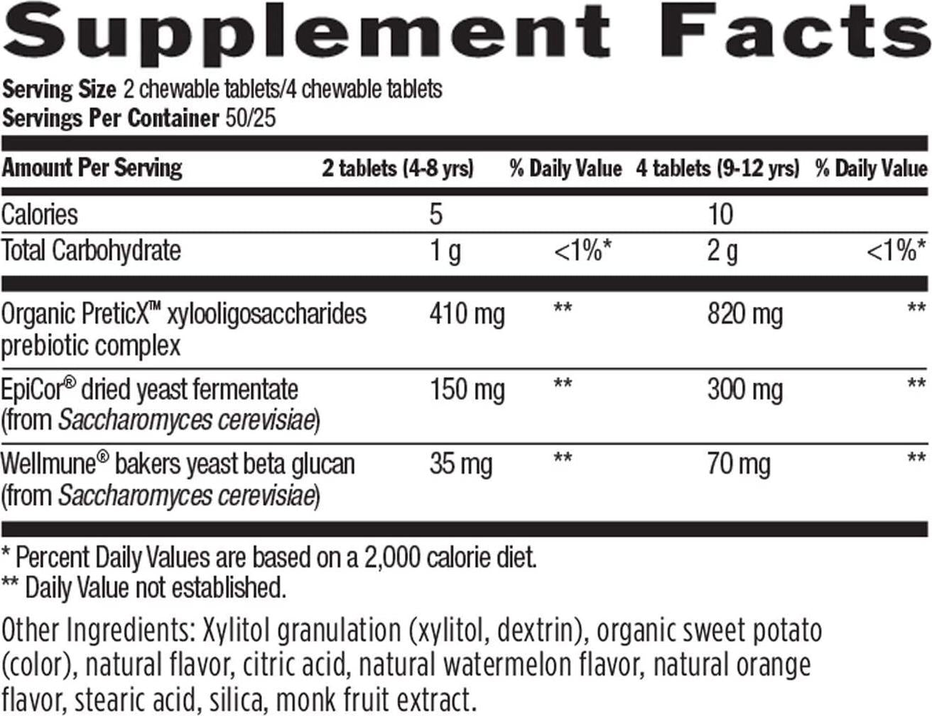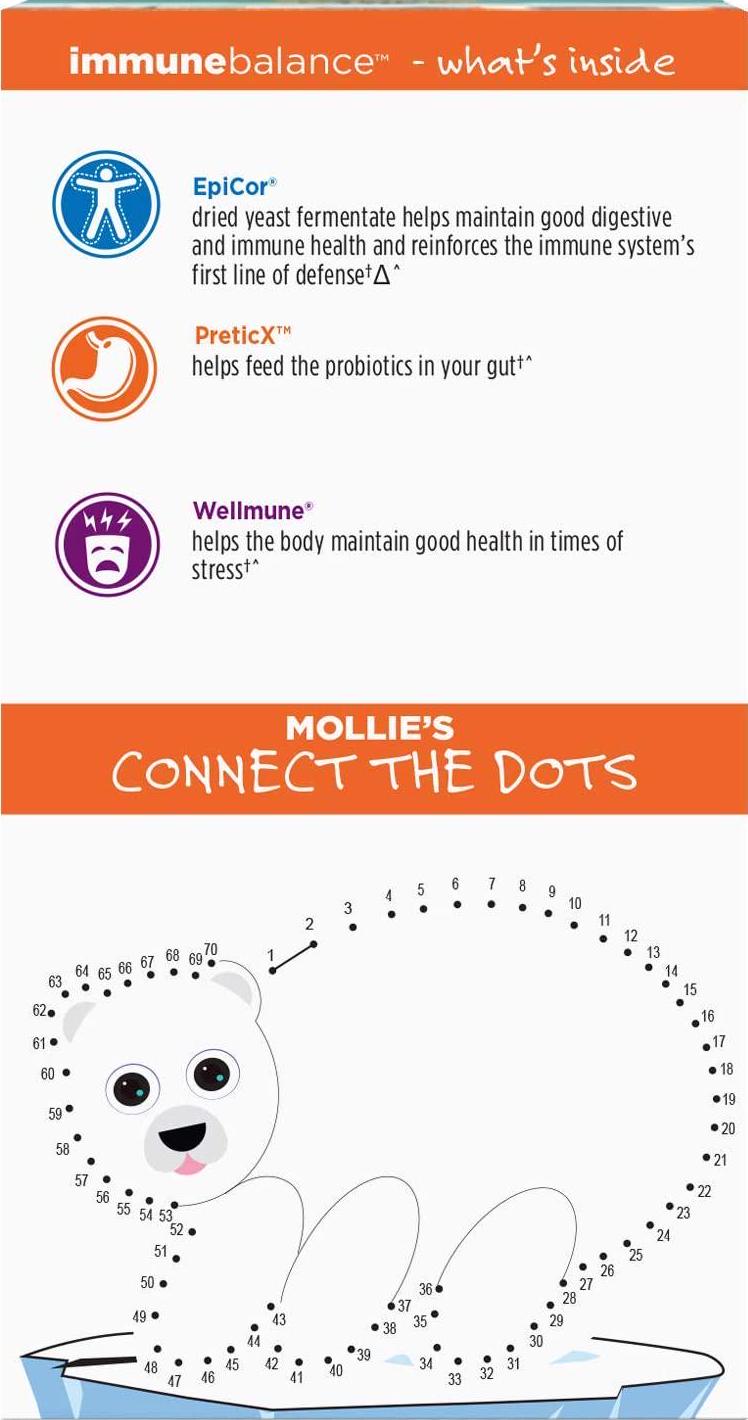 ImmuneBalance - Improves gut microbiome health and supports a strong healthy immune system. FOR KIDS! Specially formulated for immune health needs of young children. EpiCor - Dried yeast fermentate helps maintain good digestive and immune health and reinforces the immune systems first line of defense. PreticX - Helps feed the probiotics in your gut. Wellmune - Helps the body maintain good health in times of stress.