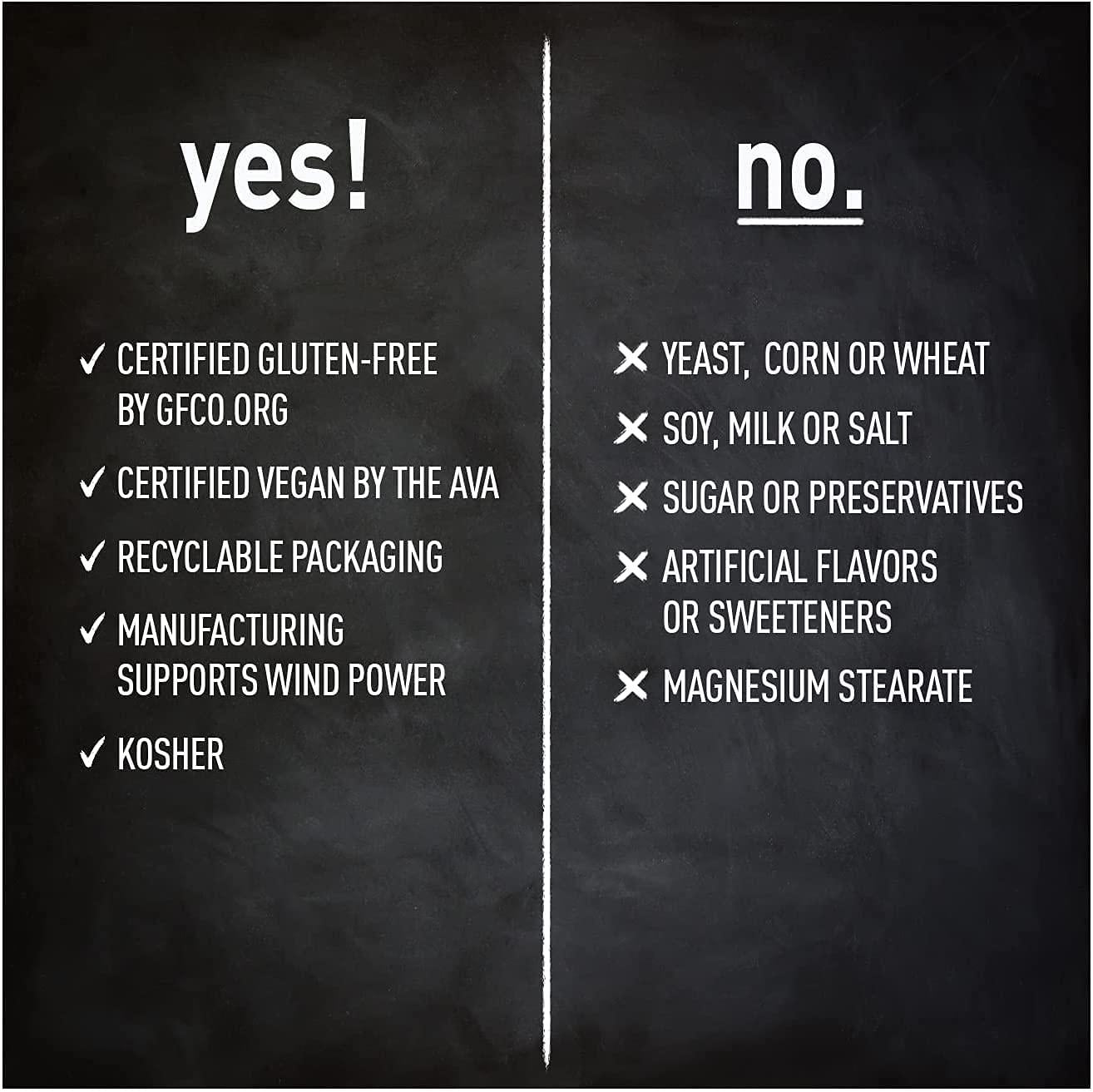 - RESPONSIBLY MADE - Certified Gluten-Free, Vegan, Kosher. Made with recyclable packaging and the manufacturing of this product supports wind power. This product does not contain wheat, corn or yeast.