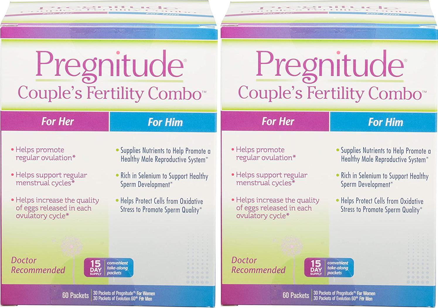 Couple's Fertility Combo - Pregnitude Reproductive and Dietary Supplement, Evolution60 Male Fertility and Reproductive Supplement - 30 Day Supply for Couple's For Her: Trying to get pregnant? The idea of becoming a mother is very exciting, but sometimes it can take longer than you would . Pregnitude is recommended for women who are having difficulty conceiving or are experiencing menstrual irregularities. Pregnitude is not a prenatal vitamin, but a unique reproductive support dietary supplement that safely and easily supports a woman's body and promotes a healthy reproductive cycle. For Him: Trying to start a family? As couples delay childbearing, age-related changes in male reproductive function are often over-looked. Aging is a natural process that can lead to changes in male physiology affecting reproductive health and sperm quality. Recent data shows that reduced fertility occurs as men age, which can result in increased time to pregnancy and decreased pregnancy rates. Evolution 60 is recommended for men, when couples are trying to have a baby, but are experiencing difficulty conceiving. Evolution 60 is a unique male fertility support dietary supplement that safely and easily supports a man's body to promote male reproductive health.