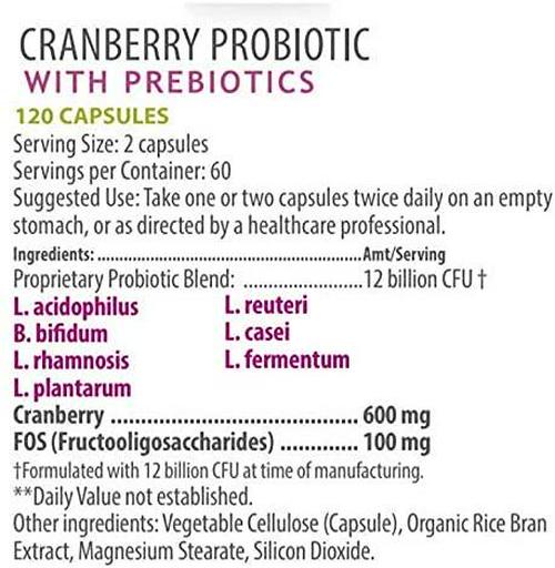 - PROBIOTICS + PREBIOTICS: Cranberry Probiotic contains 7 of the most researched strains.** L. acidophilus B. bifidum L. rhamnosus L. reuteri L. casei L. fermentum L. plantarum