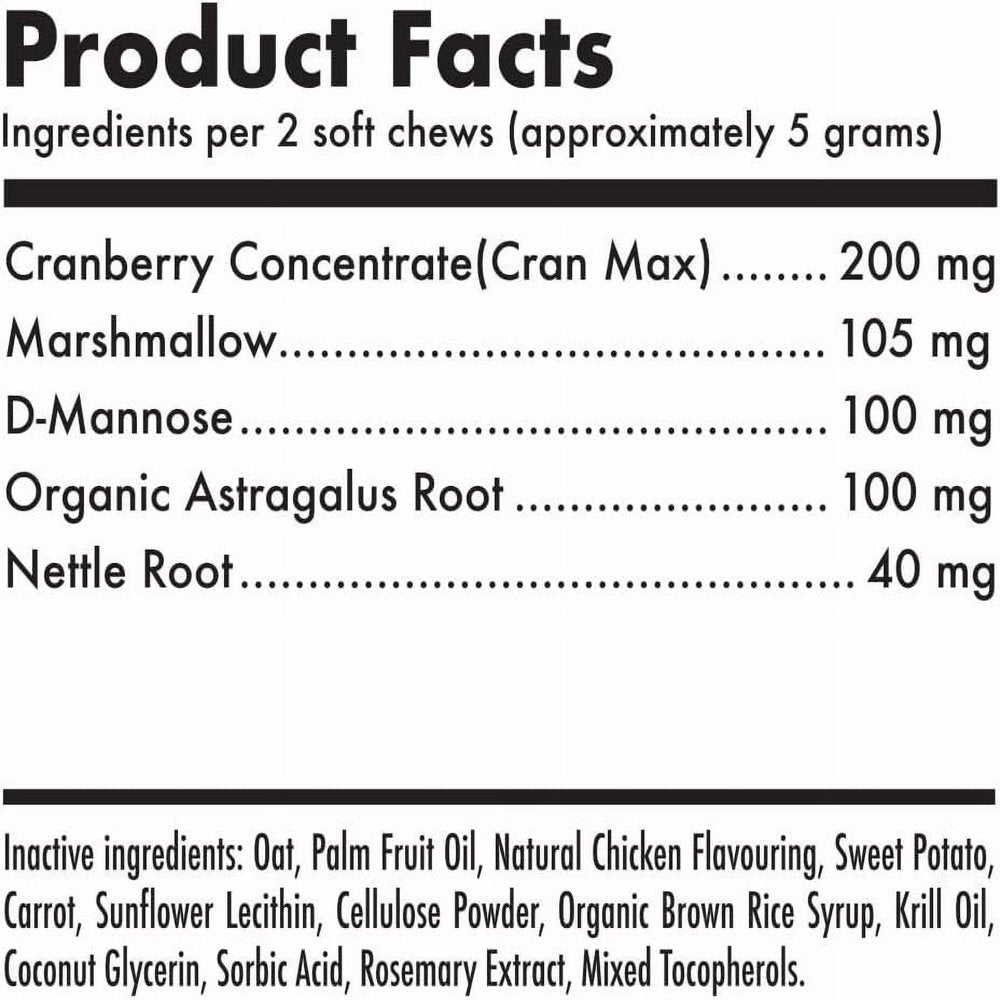 - NATURAL INGREDIENTS: Our chews contain natural ingredients like cranberry, which is known for its urinary tract benefits. Featuring D Mannose, and Nettle root, these chewable supplements contain potent ingredients that aid in kidney detoxification, defend the urinary tract lining, promote digestive health, and encourage optimal urine flow. Additionally, Astragalus root is rich in antioxidants that can potentially shield cells from harm.