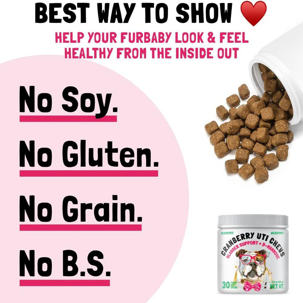 - EASY TO USE: Our soft chews make it easy to give your dog the daily support they need without the hassle of pills or liquids. Our care is evident in our pledge to provide your furry friend with a delectable taste and reliable results. LEGITPET Cranberry UTI Chews are crafted using premium, all-natural ingredients, and are free from corn, wheat, and soy. We also steer clear of artificial preservatives, colors, and flavors, ensuring that your pet receives only the best.