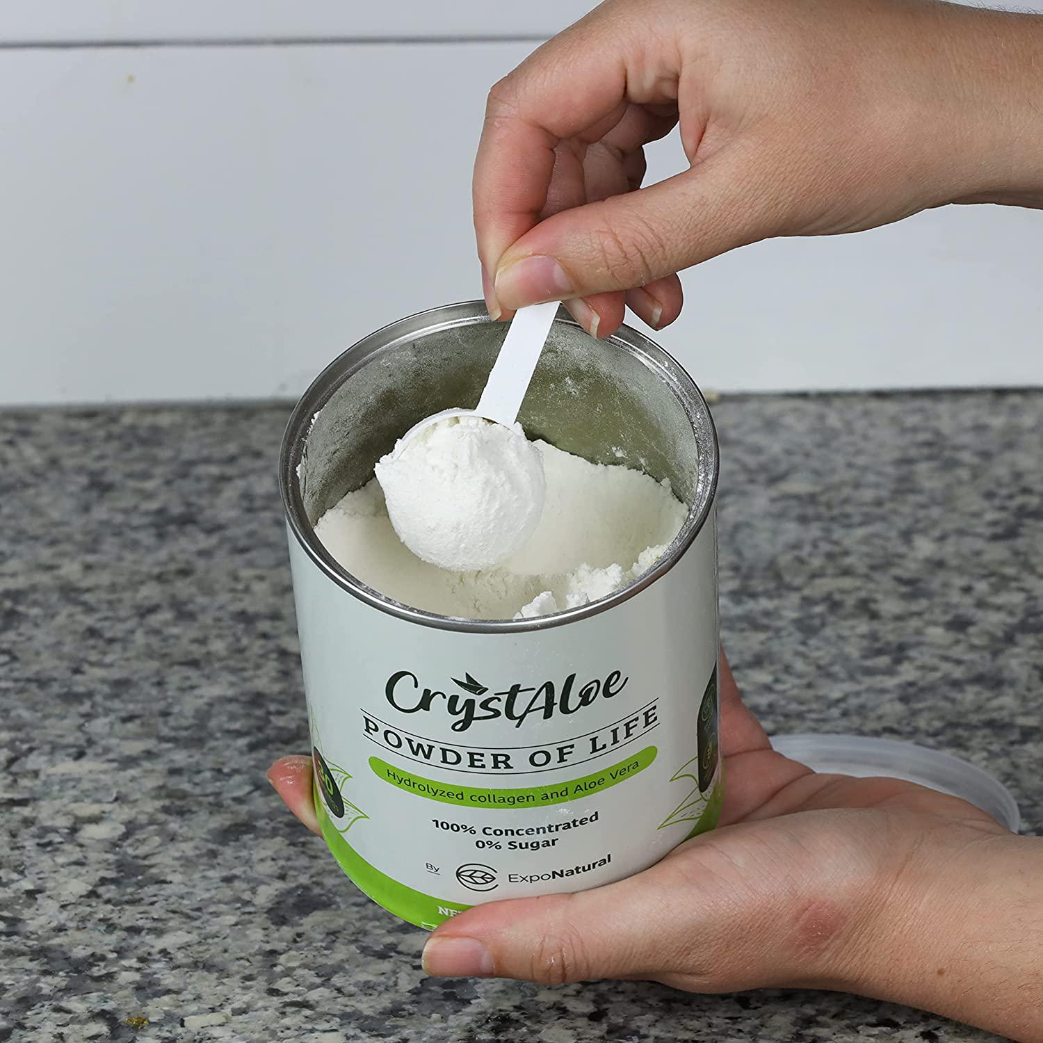Crystaloe Powder of Life - Hydrolyzed Collagen and Aloe Vera is an exclusive and innovative blend from Exponatural International, the result of our research and development department. It contains two natural ingredients: Collagen and Aloe Vera, 100% concentrated, which when mixed in a technician process, is ideal for human consumption, providing regeneration and health benefits, especially in middle and advanced age. Hydrolyzed Collagen is a dietary supplement prepared from bovine and cartilage. It is used to stimulate the production of collagen in the body, thus helping to improve the appearance of the skin and strengthen the joints, nails, bones, and hair.