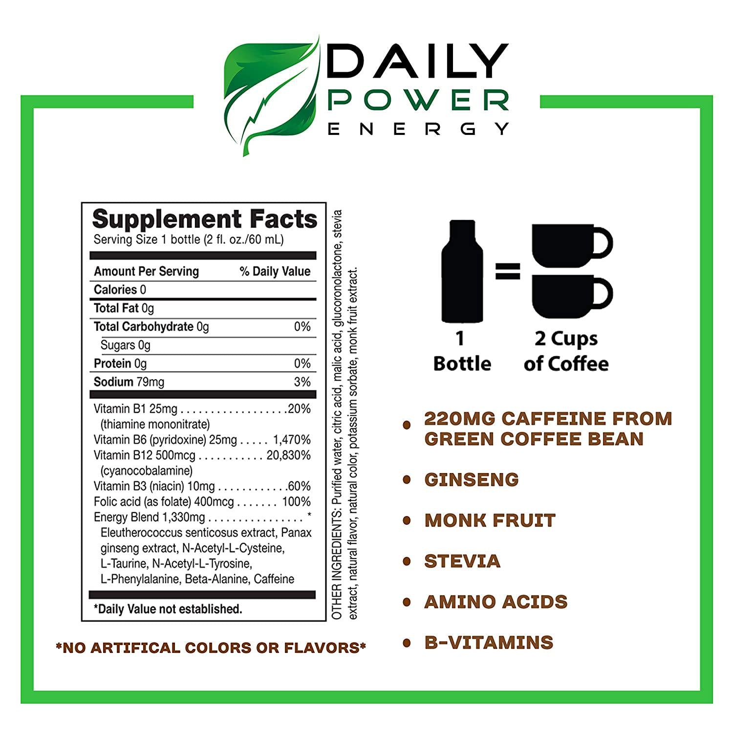 - QUALITY INGREDIENTS - All energy shots are not made equal! DailyPower energy shots sources the highest quality natural ingredients from green coffee bean extract, ginseng, monk fruit, stevia, amino acids, b-vitamins. DailyPower uses NO artificial colors or flavors! It also has 0 sugar and 0 calories!
