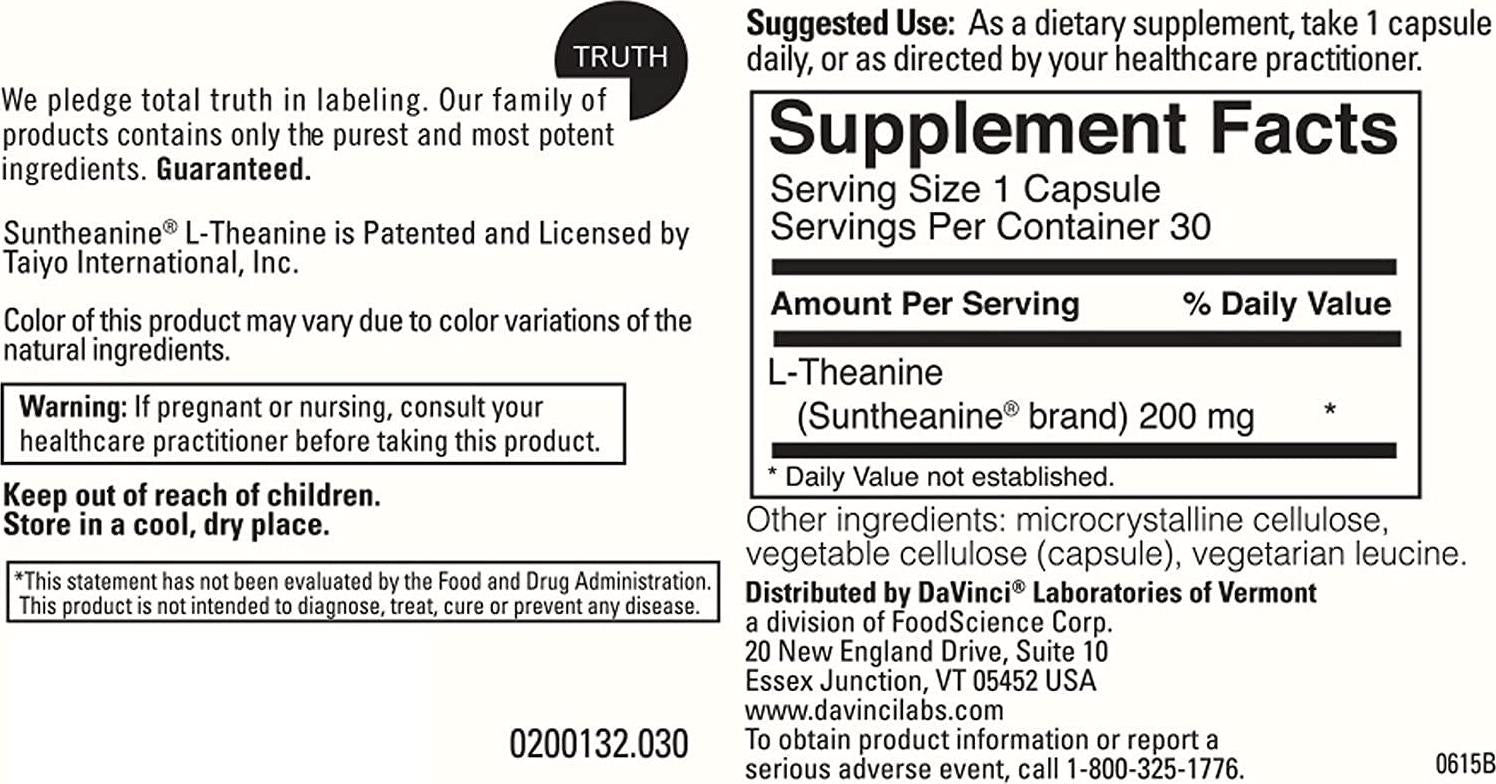 200mg, 60 count, capsules, davinci labs, l theanine, usa