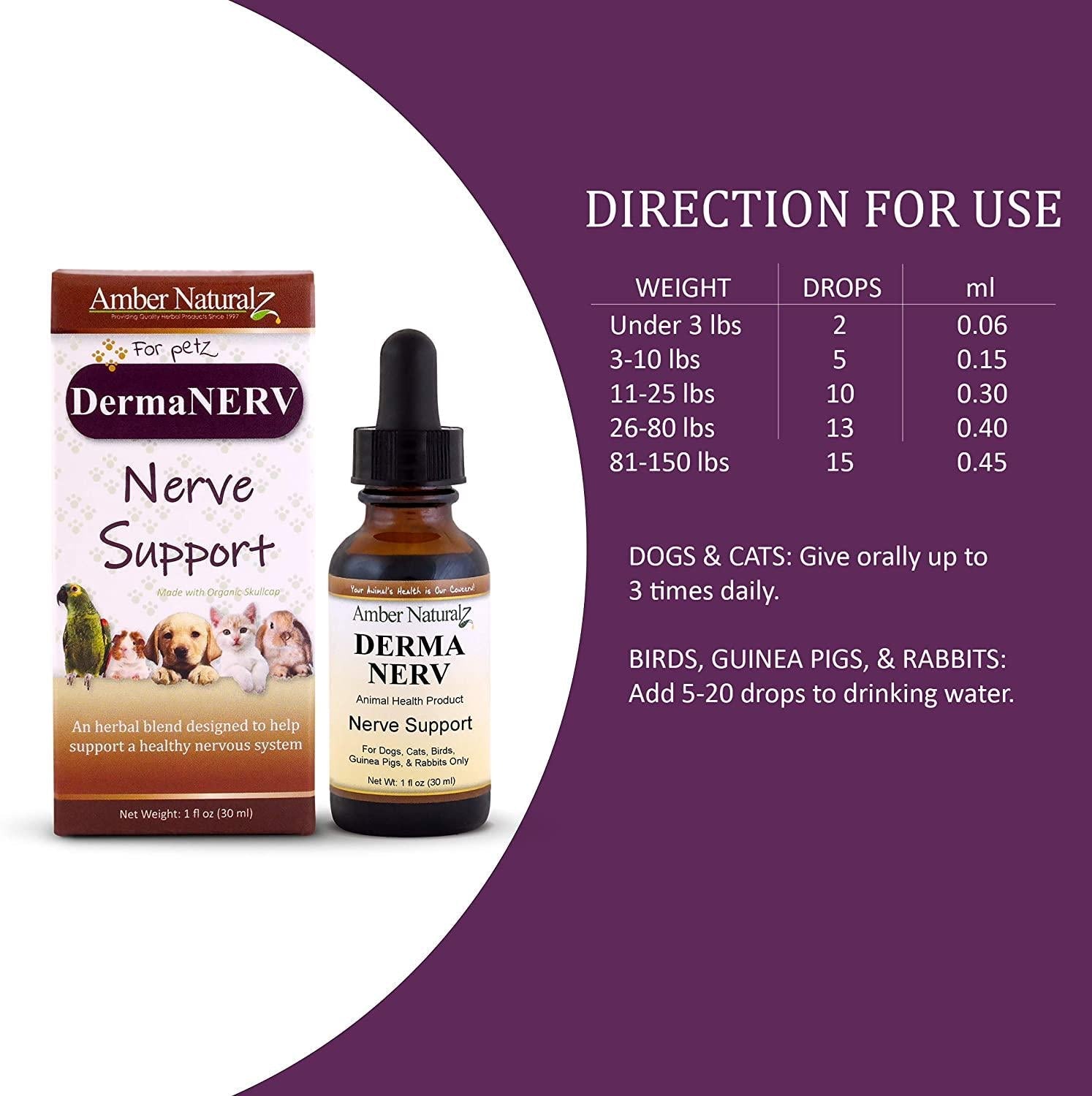 DermaNERV is an herbal blend designed to help maintain contentment during separation, travel, motion and tension caused by disruption in pet's daily routine. DermaNERV is an Animal Health Product for dogs, cats, birds, and small animals made from the highest quality herbs available and pressed only one time to ensure the best potency for your pet. Each bottle comes with instructions and a 1 cc/mL syringe. Direction for use: Give orally 2-3 times daily as needed. Active Ingredients: "Propreitary blend of (Organic Lemon Balm Leaf, Wildcrafted Yohimbe Bark, Organic Wood Betony)", Wildcrafted Skullcap, Organic Nettle Leaf. Inactive Ingredients: Filtered Water, Organic Grain Alcohol USP.