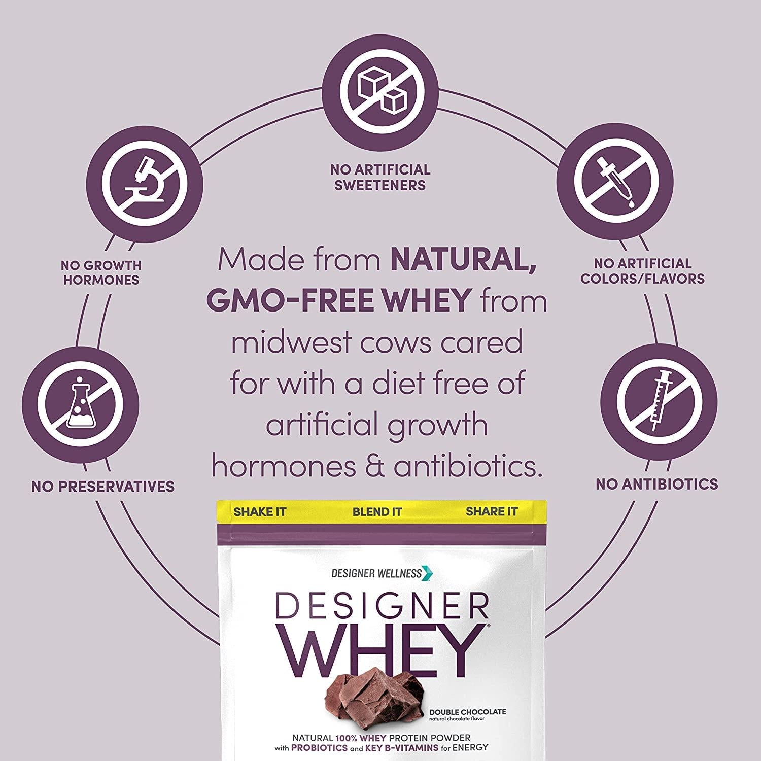 Designer Wellness Designer Whey Natural 100% Whey Protein Powder with Probiotics, Fiber, and Key B-Vitamins for Energy, Gluten-free, Non-GMO, Double Chocolate 2 lb