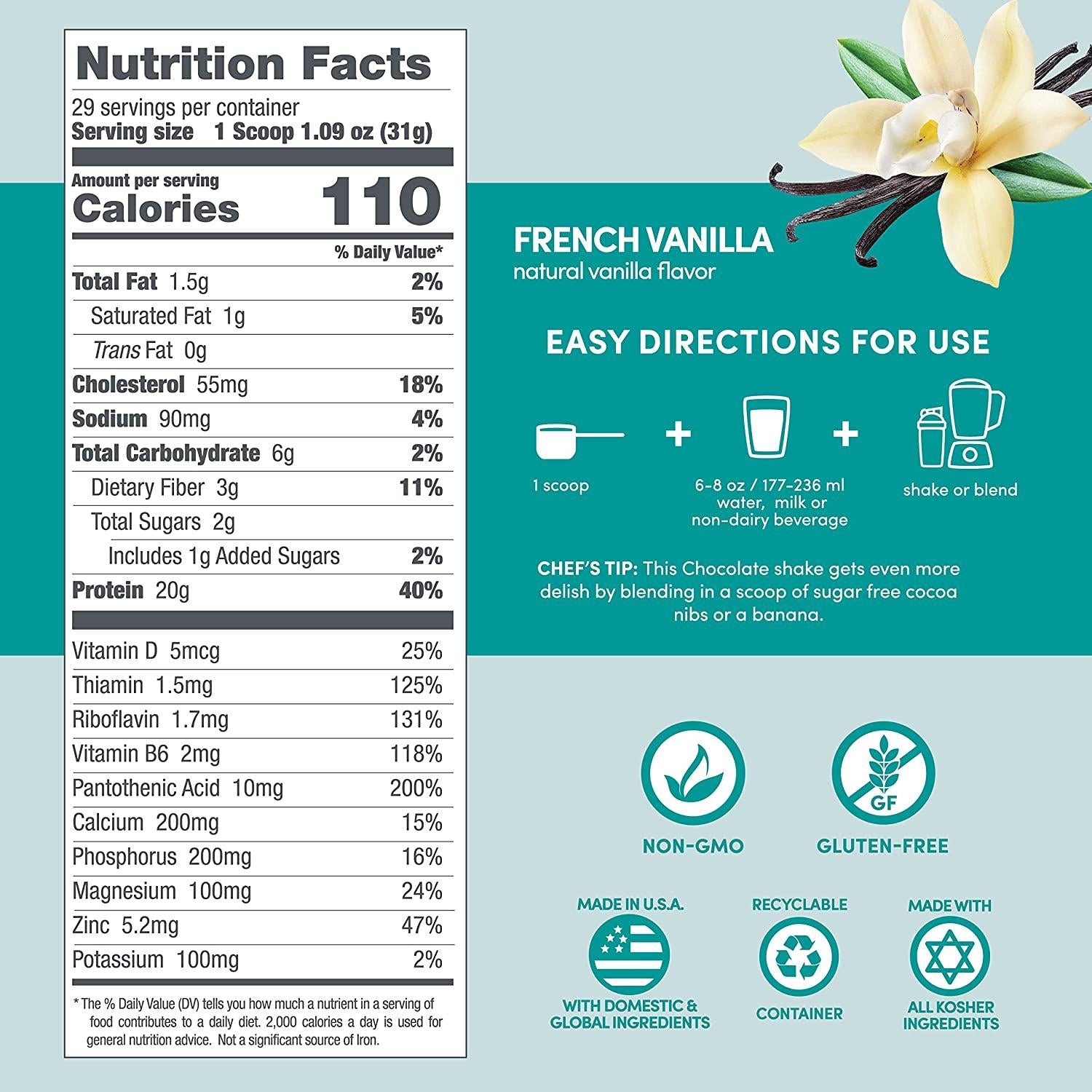 - 20g of natural protein per serving complete with all the essential amino acids