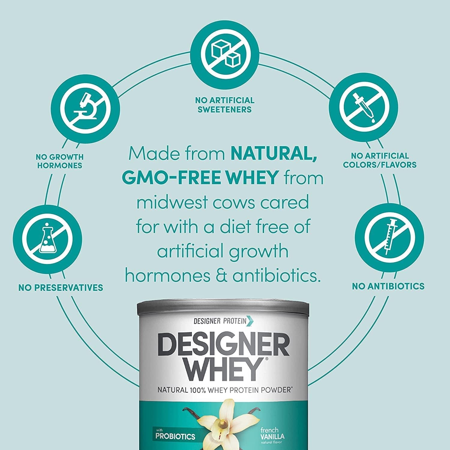 Designer Wellness Designer Whey Natural 100% Whey Protein Powder with Probiotics , Fiber, and Key B-Vitamins for Energy, Gluten-free, Non-GMO, French Vanilla 12 oz