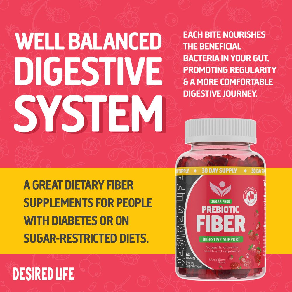 Desired Life Sugar Free Prebiotic Fiber Gummies for Adults and Kids Mixed Berry Flavor Plant Fiber Supplement for Women and Men, Daily Fiber for Digestive Health and Regularity 60 Count (Pack of 1)