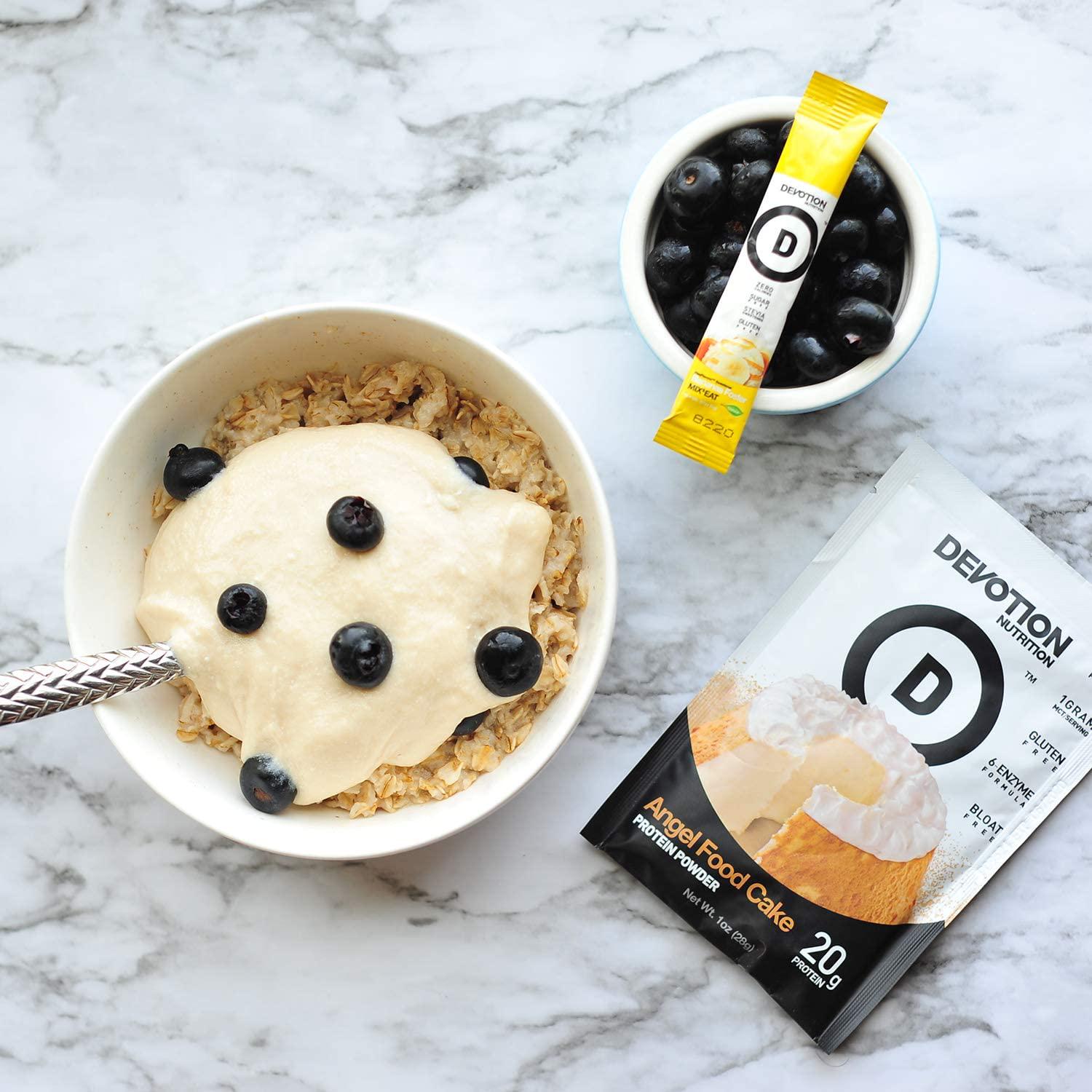 - DELICIOUS PROTEIN POWDER: Includes (12) Single Serving Packets of Devotion Nutrition Angel Food Cake Protein Powder that are conveniently packaged and great for on the go.