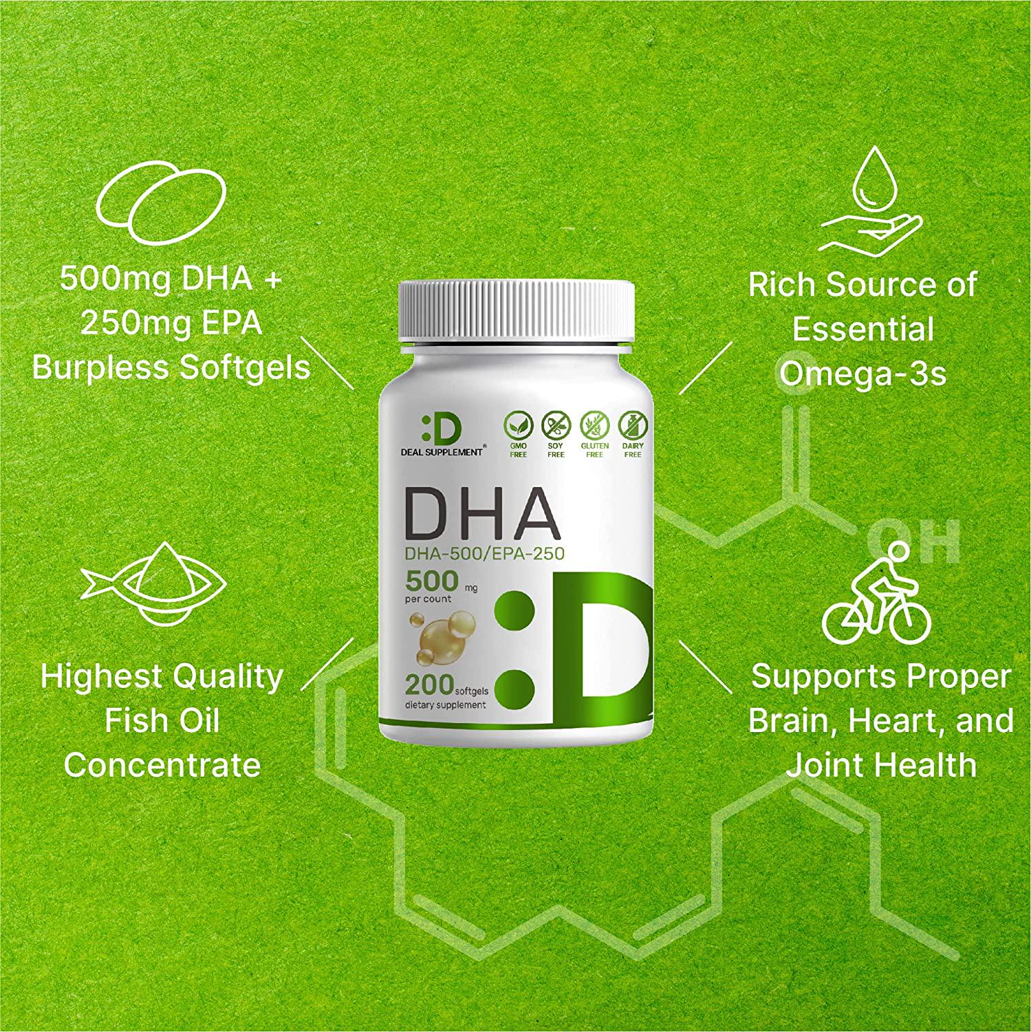 - Maximum Potency - Deal Supplement Omega 3 DHA EPA Supplement, contains DHA 500mg, EPA 250mg, other omega 3s 250mg in a single burpless softgel, 200 counts, up to 200 days supply.