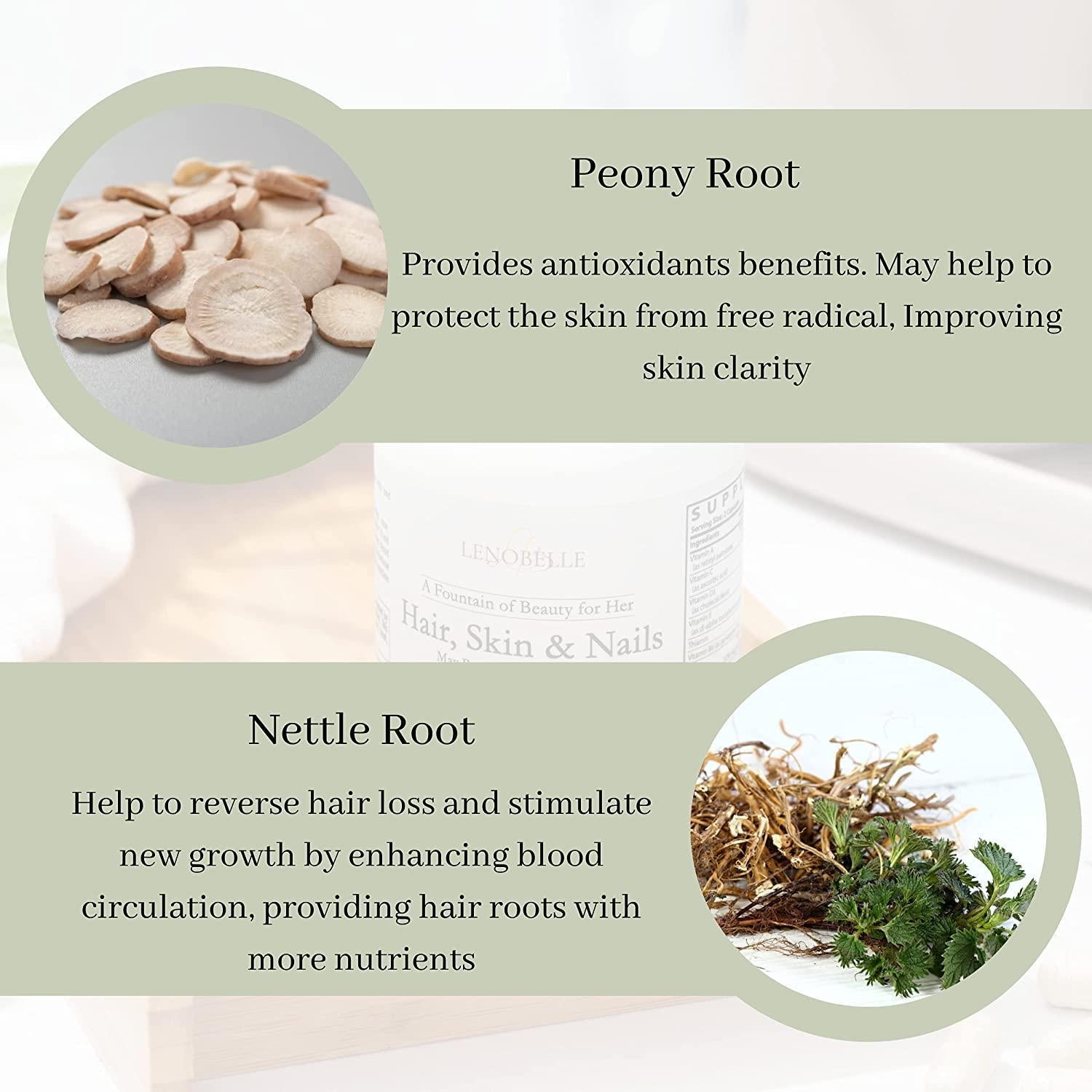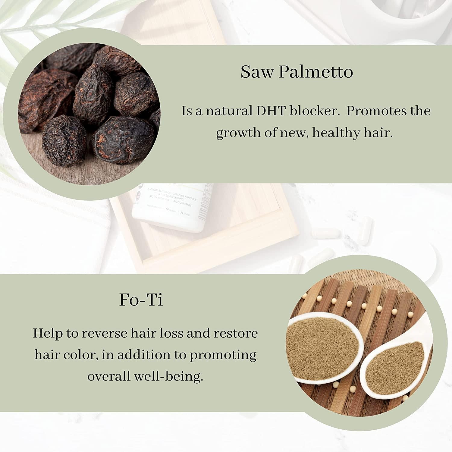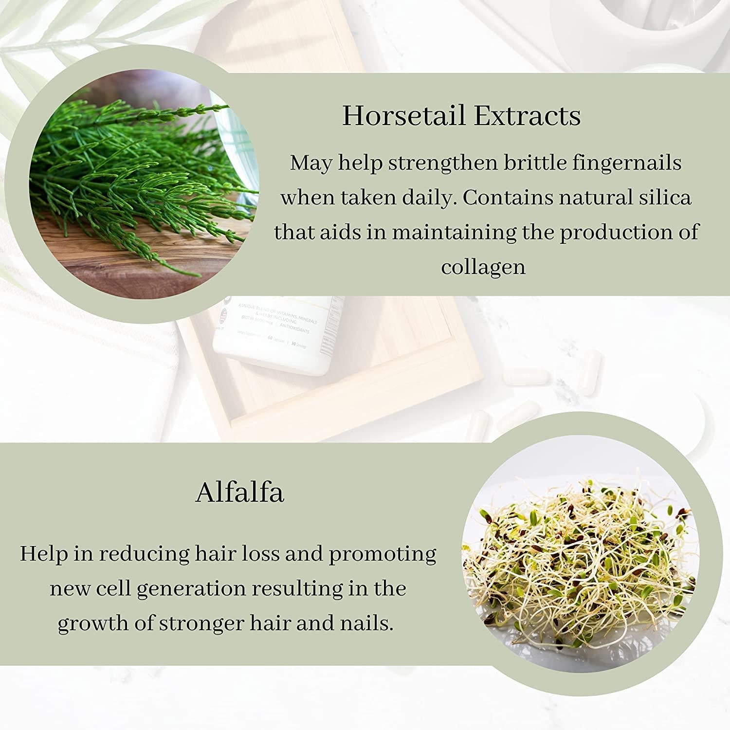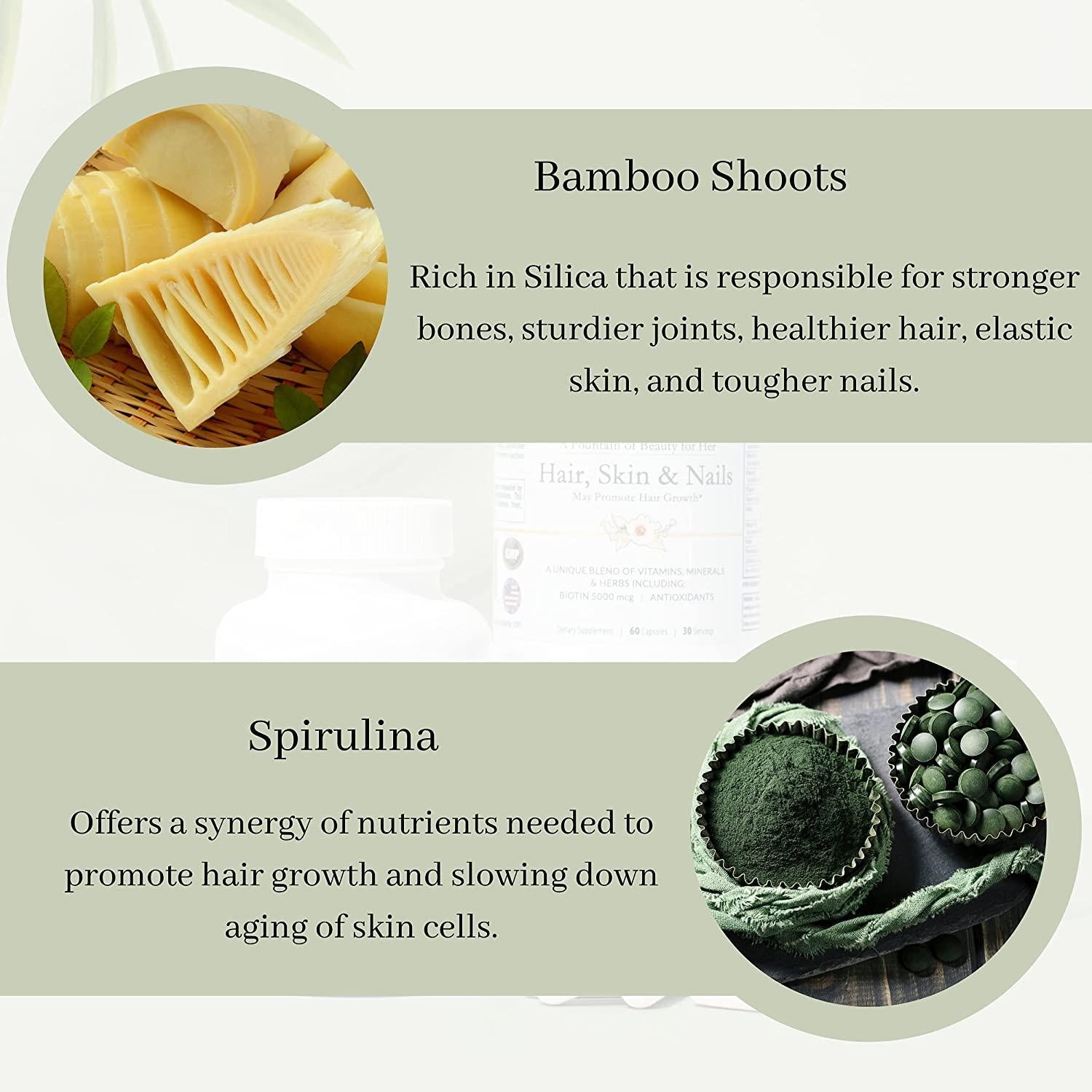 - 𝐂𝐎𝐍𝐓𝐀𝐈𝐍𝐒: Biotin 5000mcg, Antioxidants (including Vitamins A, C, and E), Horsetail supplements, Fo-Ti Root Powder, Bamboo silica, Nettle Root Extract, Peony Root Extract, Spirulina, Saw Palmetto for women, Alfalfa, hair vitamins for faster hair growth