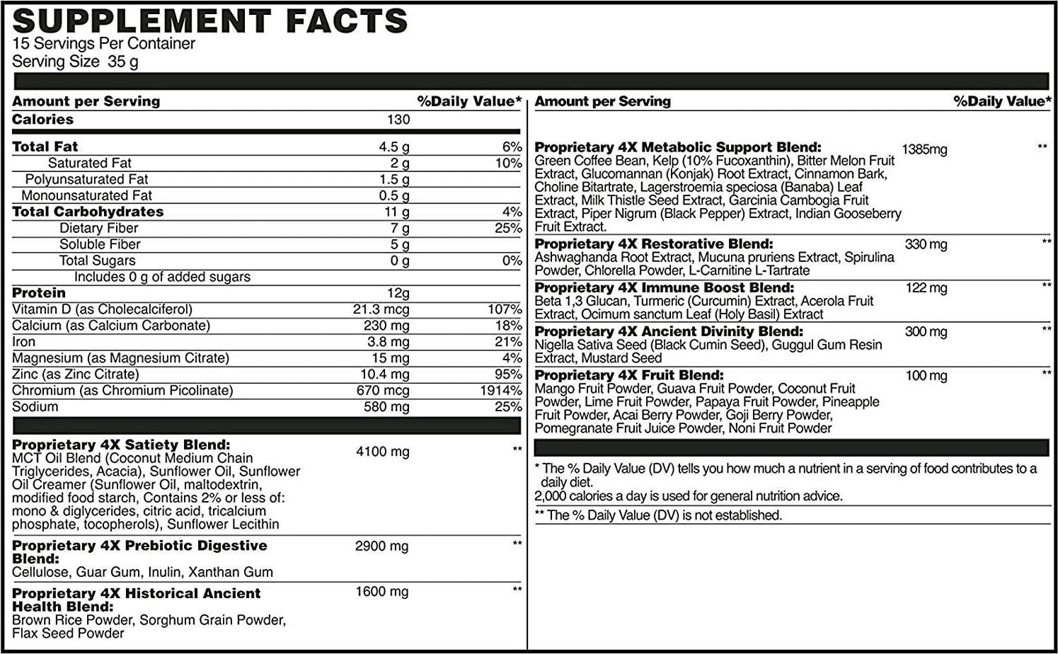 A unique 100% vegan formulation designed to help satisfy your appetite and increase your energy so you can regain and maintain control of your health. It provides essential amino acids, branched chain amino acids, enzymes, prebiotics, fiber, nutrient enhancing botanicals, naturally occurring vitamins, minerals and Dick Gregorys famous 4X Formula. The 59 ingredients used in the formulation of Dick Gregory's Caribbean Shake for Optimal Health are the highest quality. Dick Gregorys Caribbean Shake for Optimal Health is different from other protein and nutrition drinks because the ingredients were selected by Mr. Gregory and his scientific team specifically to enhance the users overall health. The Dick Gregory Caribbean Shake for Optimal health is sold by weight, not by volume. When you receive your new container it will not be filled to the top. The enclosed scoop is one serving of 35 grams. Each container has 15 servings when used according to the instructions for a total of 525 grams as indicated on the label.