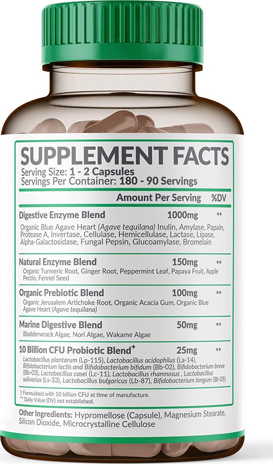 - Complete digestive enzyme pills complex blend with essential organic blue agave heart, inulin, amylase / amilasa, papain, protease A, invertase, cellulase, hemicellulase, lactase, lipase / lipasa, alpha-galactosidase, fungal pepsin, glucomylase, & bromelina & bromelain supplement. Plus your probiotic supplement and prebiotic supplement (pre & pro) at the same time. All in a convenient purified cap / capsule form which you can open and take as a chewable with dietary nutrients, super food or meal