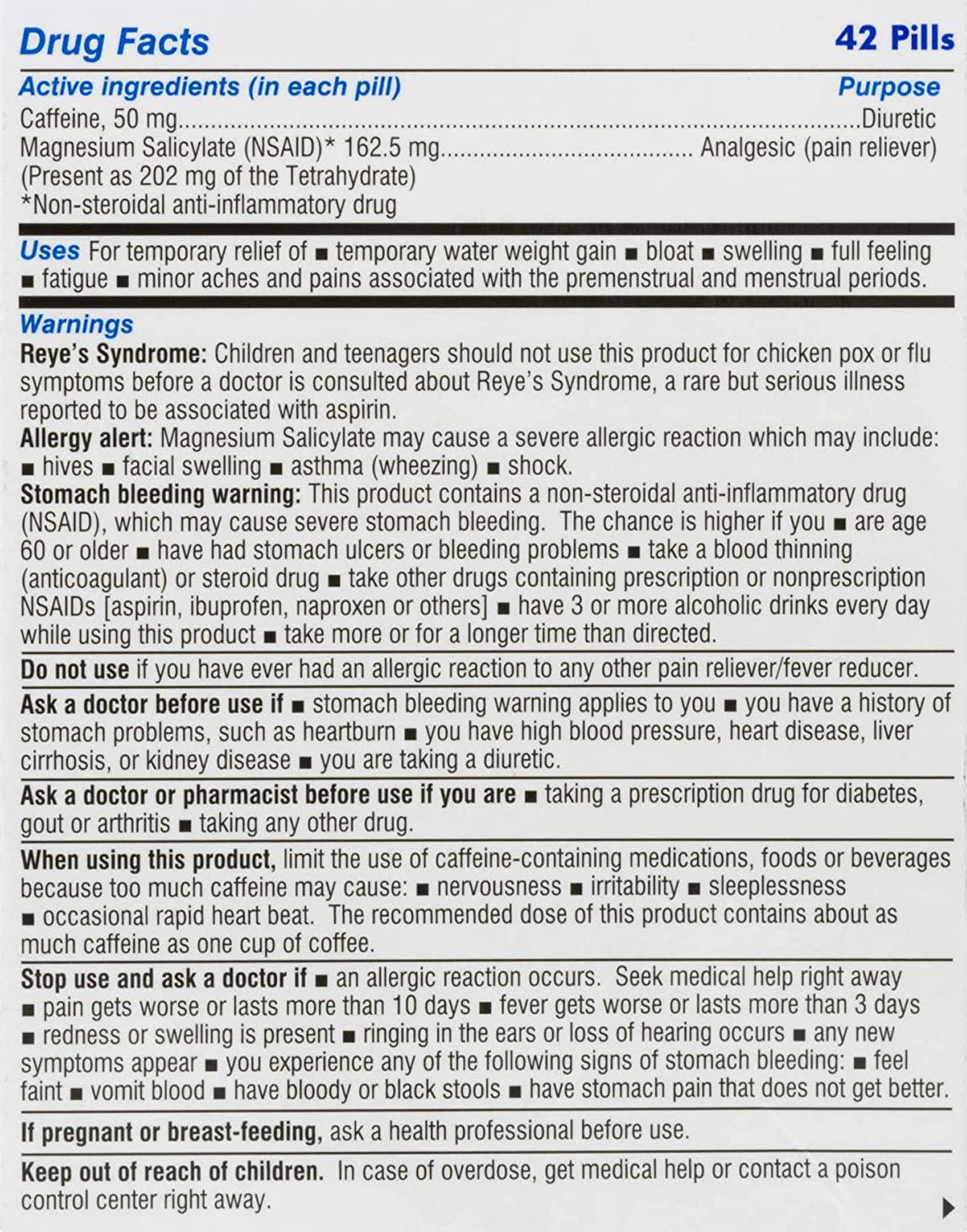 For temporary relief of temporary water weight gain, bloat, swelling, full feeling, fatigue, minor aches and pains associated with the premenstrual and menstrual periods