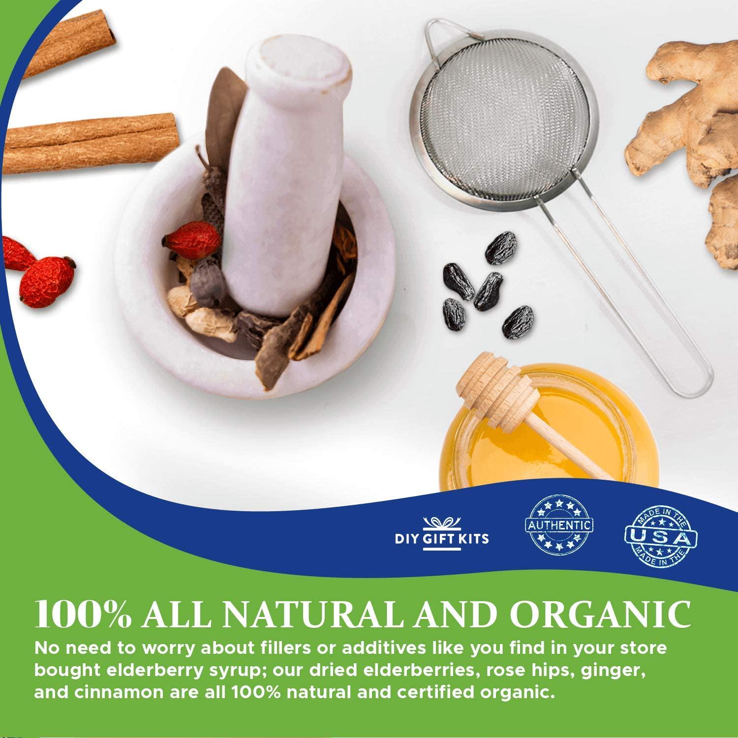 - 100% All Natural And Organic – No need to worry about fillers or additives you find in your store bought elderberry syrup! Our dried elderberries, rose hips, ginger, and cinnamon are all 100% certified organic.