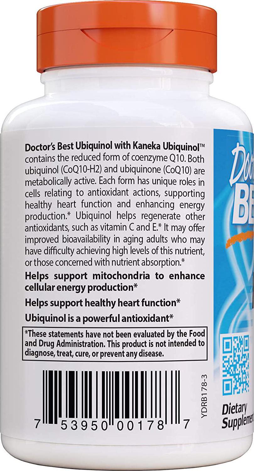 Doctors Best Ubiquinol featuring Kaneka QH contains the reduced form of coenzyme Q10. Both ubiquinol (CoQ10-H2) and ubiquinone (CoQ10) are metabolically active, and are found naturally in the body and in food sources. The two forms are interchangeable, as the body appears to keep the reduced and oxidized forms in the total pool at a constant ratio.1-3 Each form has unique roles to play in cells including antioxidant actions and enhancement of energy production in the mitochondria. The commonly available supplement form of coenzyme Q10 has been the oxidized form (ubiquinone), as until recently the reduced form was difficult to manufacture due to its rapid oxidation in the air. New technology has allowed for the manufacturing of stable coenzyme Q10 in the reduced form.4 The results from an animal study that compare the absorption of the two different forms, as well as a human study showing significant absorption of ubiquinol, together suggest that taking ubiquinol orally may offer improved bioavailability in individuals who have difficulty achieving high levels of this nutrient, such as aging adults or those concerned with nutrient absorption.4 Comparison studies of the two forms are now necessary in humans to confirm this idea, as well as determine the specific circumstances under which ubiquinol may be more beneficial.