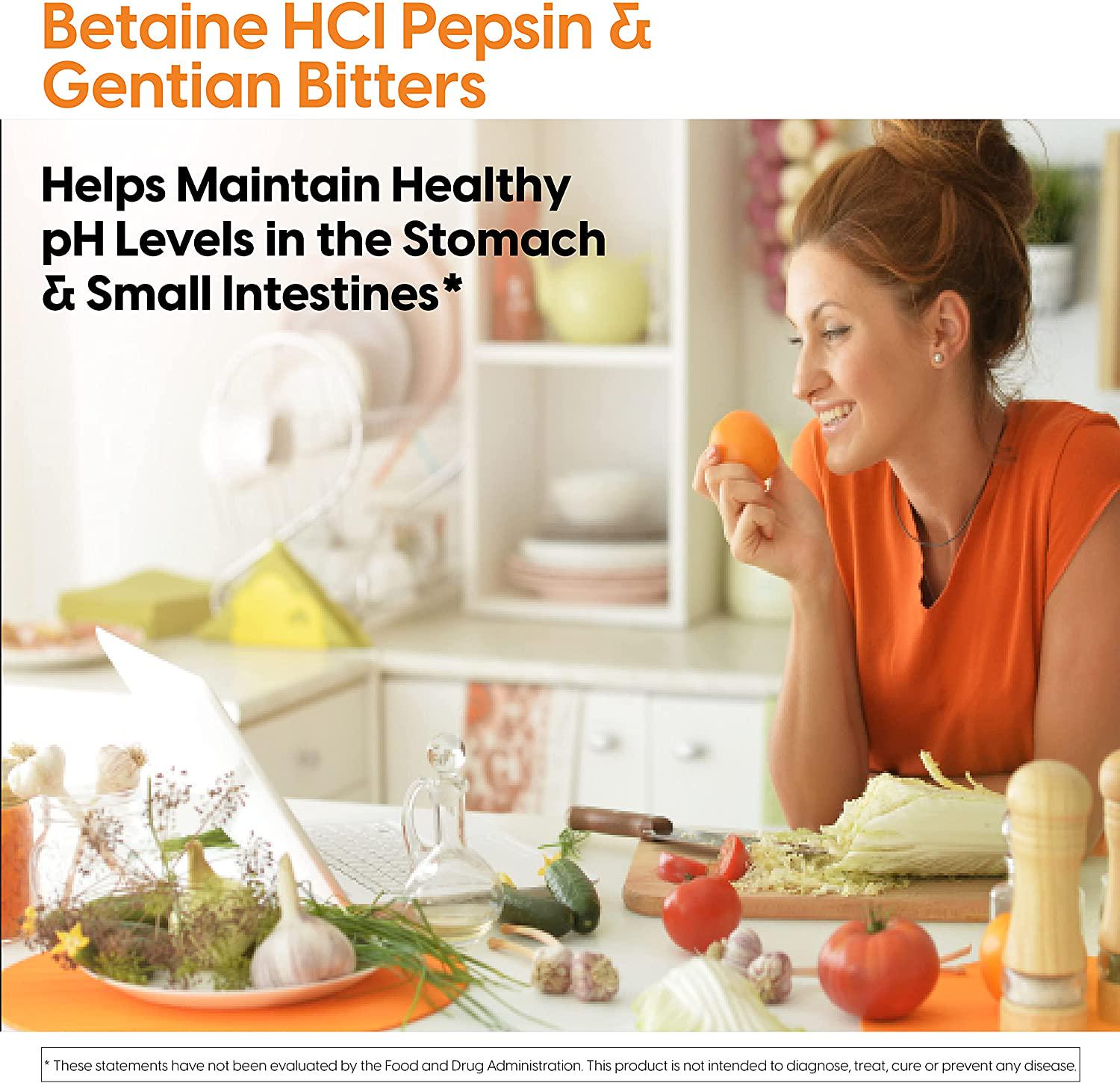 Betaine hci/pepsin/gentian bitters contains three nutritional factors that perform complementary functions designed to support the efficiency of the digestive process. supplementing with betaine hci may support the stomach's digestive capacity. pepsin is an enzyme produced by the body to digest protein-containing foods in the stomach. pepsin works in conjunction with stomach acid to support protein digestion. gentian is an herb used to optimize the digestive capacity and tonify the digestive tract. its bitter nature may help to stimulate the body's production of digestive enzymes.for optimal digestive support, use this supplement in conjunction with best digestive enzymes - all vegetarian, a uniquely formulated, full-spectrum high potency digestive enzyme blend.