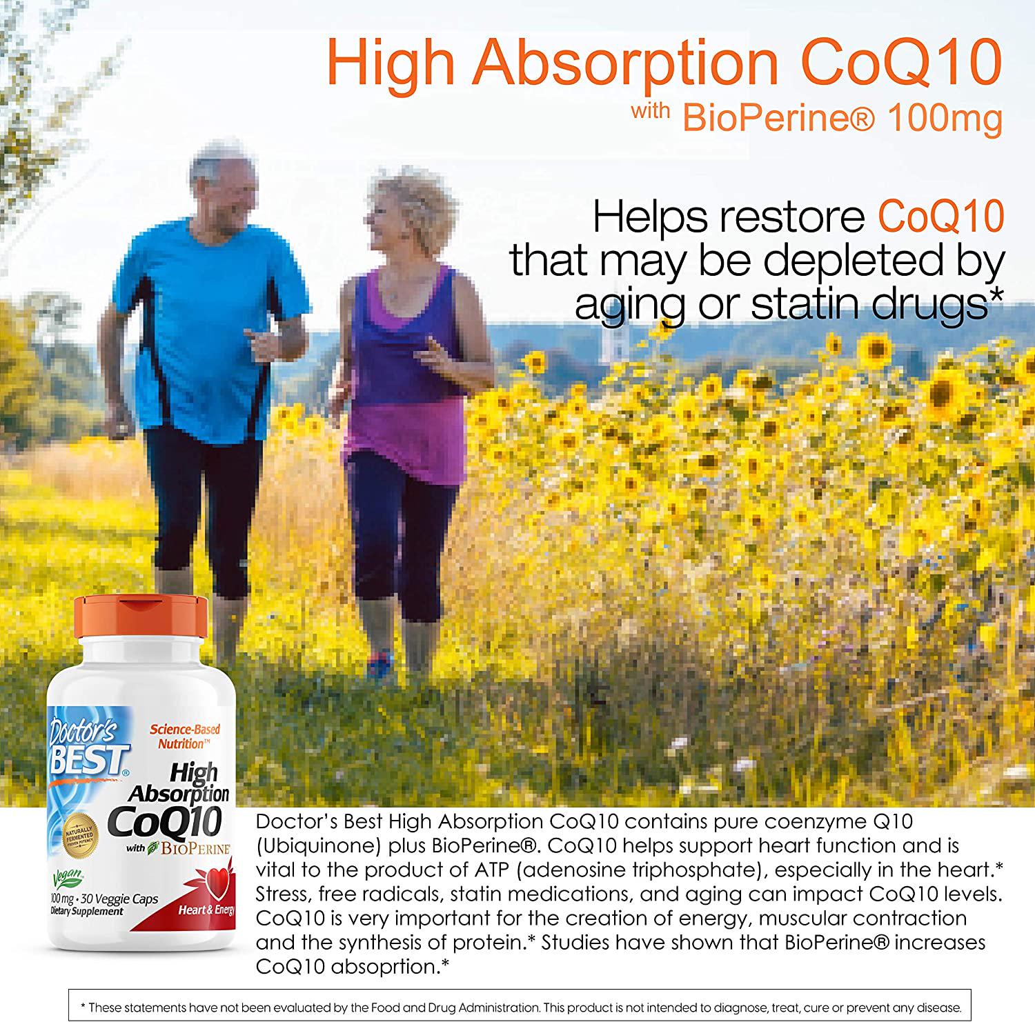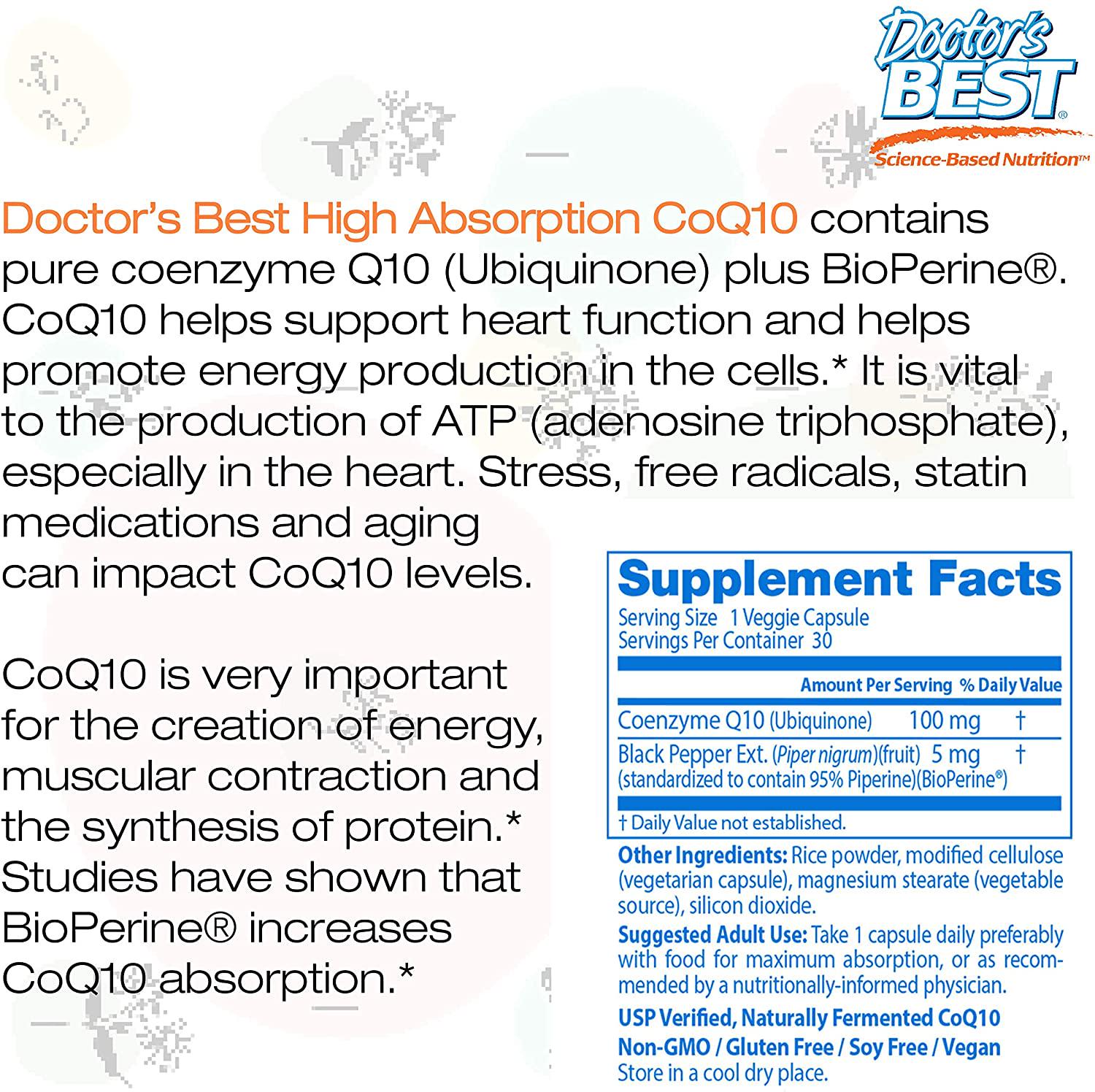 - DOCTORS BEST HIGH ABSORPTION COQ10: Easy-to-absorb form of a key nutrient that powers and protects heart vitality, cardiovascular health and cellular energy. CoQ10 also supplies antioxidant support to the heart, where it is naturally concentrated.