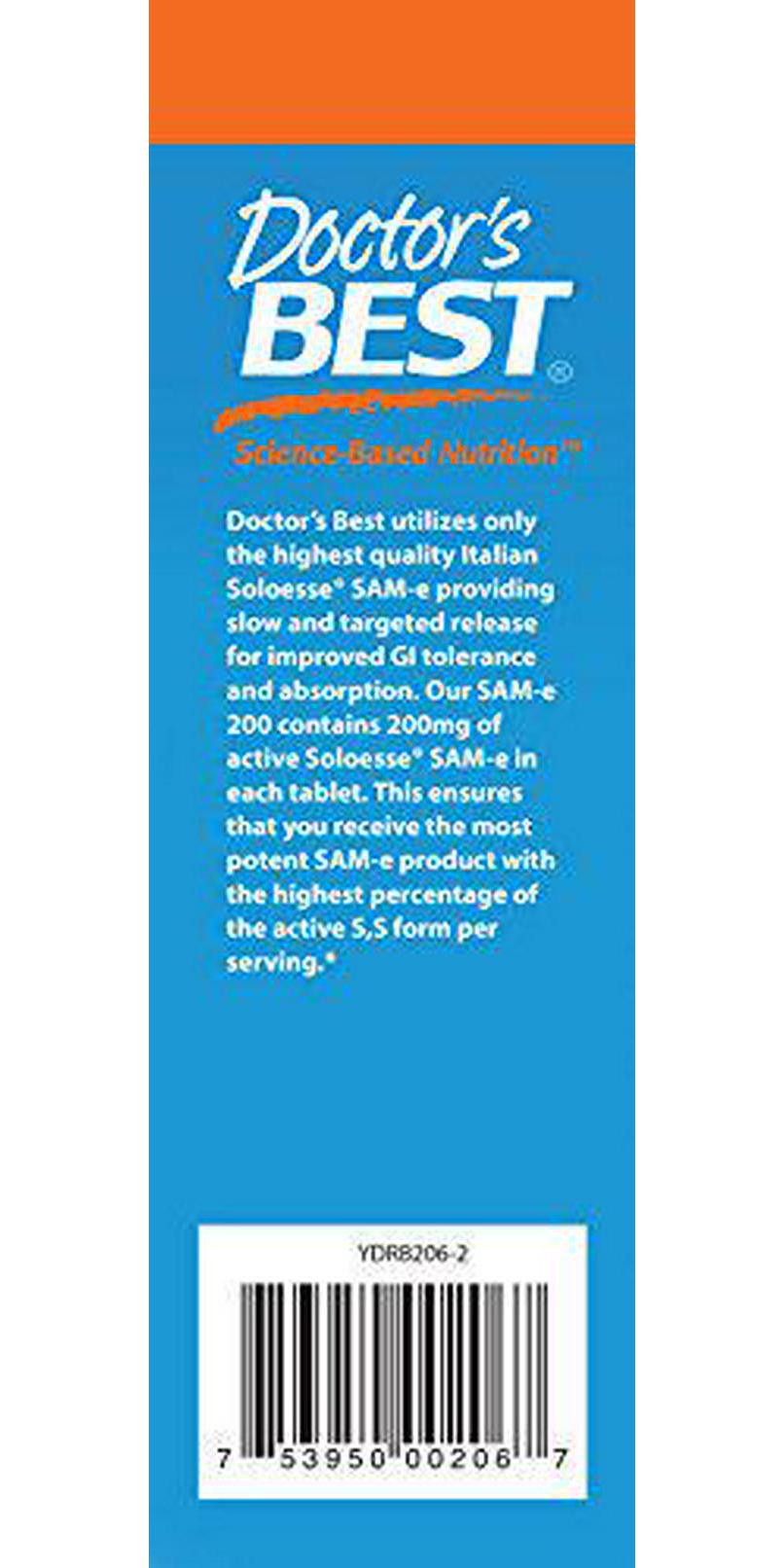 Doctor s Best SAM-e is proven to enhance mood and promote cognitive health. It is essential for the healthy metabolism of the major brain transmitters dopamine, serotonin and norepinephrine. In addition, SAM-e promotes joint comfort and mobility and supports liver health and detoxification. SAM-e effectiveness has been published in 18 controlled human trials published over 40 years. Doctor s Best SAM-e uses pharmaceutical grade materials. SAM-e is derived from the amino acid methionine and is one of the most important methyl donors in the central nervous system. SAM-e optimized for potency, stability, and to survive the stomach acid and reach the intestine (where it is absorbed). Effectiveness of SAM-e has been backed by at least 18 controlled human trials published over almost four decades.