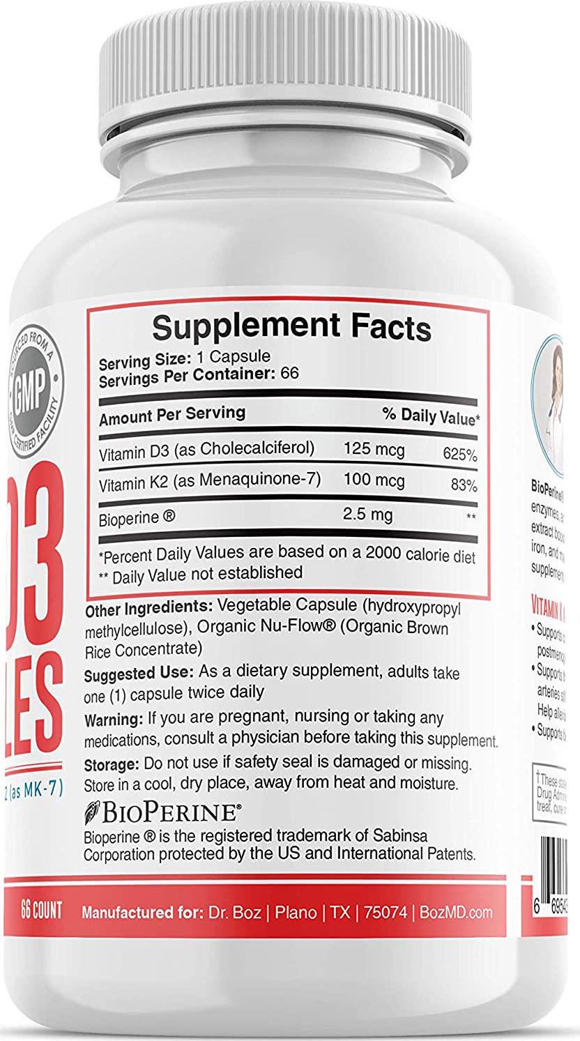 Dr. Boz Vitamin K2 (MK-7) + D3 Capsules with Bioperine for Best Absorption | Vitamin D Supplement | Vitamin K Supplement | Vitamin K2 D3 Supplement [Bone Health | Heart Health]- 66 Count