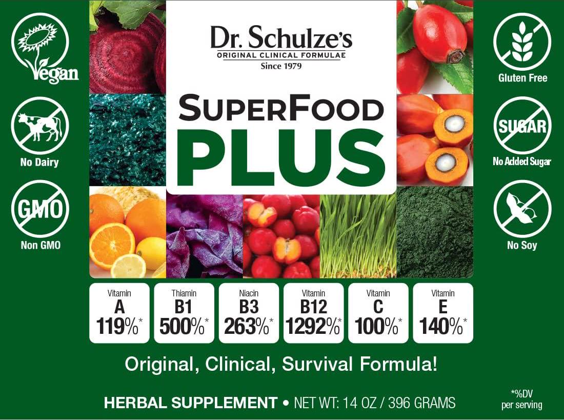 Dr. Schulze's SuperFood Plus blasts your body with a rich supply of nutrients that are formulated to increase energy and overall vitality. SuperFood Plus is also protein rich for your daily workout needs with over 40% protein by volume!Herbal Ingredients: