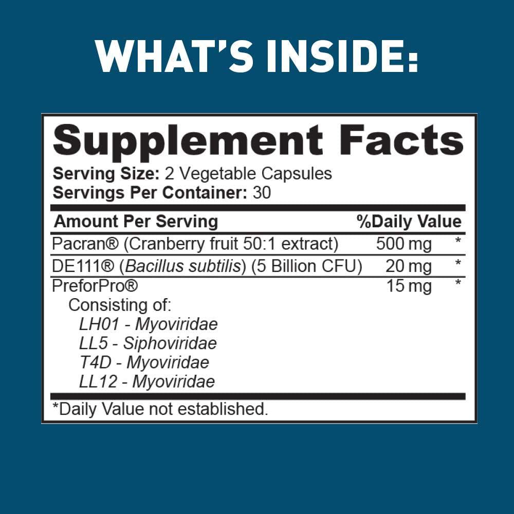5 Billion CFU Reinforced by our Patented Probiotic Booster PreForPro? - a highly effective Prebiotic that only feeds the good bacteria and works against the bad bacteria.;With Pacran? Organic Cranberry Extract - Clinically studied and substantiated to make a Supports Urinary Health claim. Pacran? is the first cranberry ingredient in the world that can freely market a government sanctioned health claim. We use the dosage that was used in the study.;SPORE-ENHANCED FOR CLINICALLY PROVEN BENEFITS (DE111?) - DE111? supports the normal proliferation of beneficial bacteria and the normal immune reaction of intestinal cells. NO Refrigeration Needed - Long Shelf Life. Spore forming strains are the only ones that remain viable under a wide range of temperature;PROVEN STOMACH ACID PROTECTION - With Advanced Patented Capsules DRCaps? for Proven Targeted Release. Delivers Deeply Into the Intestines. Most others don't. DRCaps? do not have after-taste, they are vegetarian with Kosher and vegetarian certifications.;QUALITY MADE IN THE USA: 1 Month Supply of 60 delayed release capsules, made in the USA according to cGMP stardards. Use with pride and confidence.