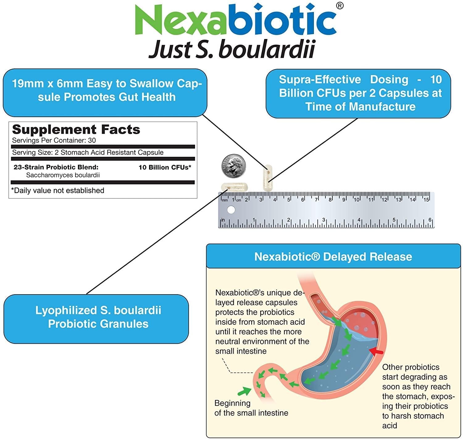 DrFormulas Nexabiotic Saccharomyces boulardii also modulates your immune system to ensure your intestinal barrier is functioning optimally. Recent studies show that S. boulardii may also help alleviate the symptoms of diarrhea and prevent recurring C diff. Each serving is resistant to stomach acid and contains 10 Billion CFUs, so you can be sure that you're getting the health benefits exactly where you need them. Go with your gut and get Nexabiotic!