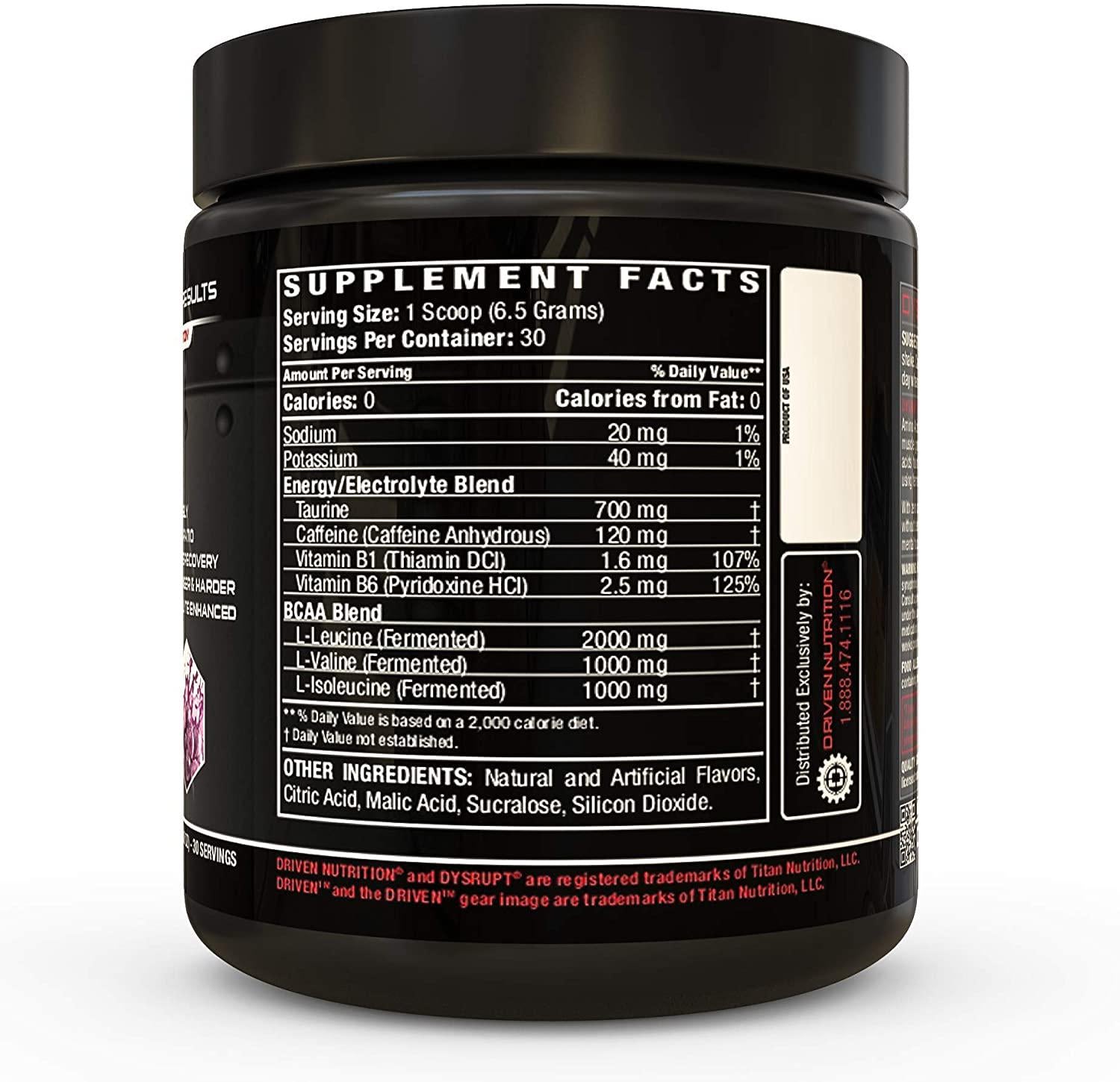 THE PERFECT ENERGY BOOST FOR INCREASED PRODUCTIVITY OR ATHLETIC PERFORMANCE Sometimes life demands more of you than you feel you have to give. Maybe you're exhausted from a tough day of work or didn't get quite enough sleep the night before. How do you perform when your energy and focus are not up to par? Enter Driven Nutrition's DYSRUPT energy powder. With DYSRUPT, you get a key blend of hydrating electrolytes, stimulating caffeine, and 2:1:1 muscle-fueling branched-chain amino acids (BCAAs). This combination keeps you hydrated and feeling sharp enough to carry out your work schedule and workouts. With the caffeine equivalent to a single cup of coffee, you can enjoy a nice boost in energy without the jitters. Package Contents: (1) Driven DYSRUPT Energy Powder Product Details: Serving Size: 1 Scoop Number of Servings: 30 Flavors: Grape Smash, Berry Bash, and Fresh Lemonade 120mg of Caffeine Per Serving BCAA Blend Contains: 2000 mg L-Leucine, 1000 mg L-Valine, 1000 mg L-Isoleucine Zero Calories, Low Carb/Sugar Free, Vegan, Gluten-Free, Dye-Free At DRIVEN, we're committed to providing high-quality supplements for people with an active lifestyle. Whether your goal is to lose weight, increase muscle mass, or burn fat, we formulate supplements that provide you with the support you need to train hard and recover fast.