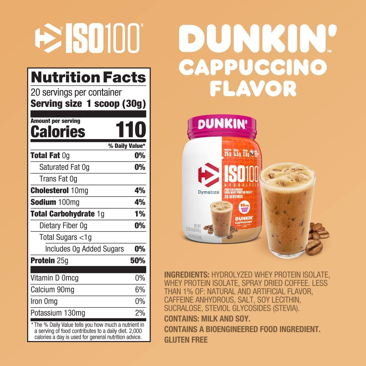 - 20 servings of Dymatize ISO100 in Dunkin' Cappuccino flavor Protein Powder, with 95mg of caffeine per scoop