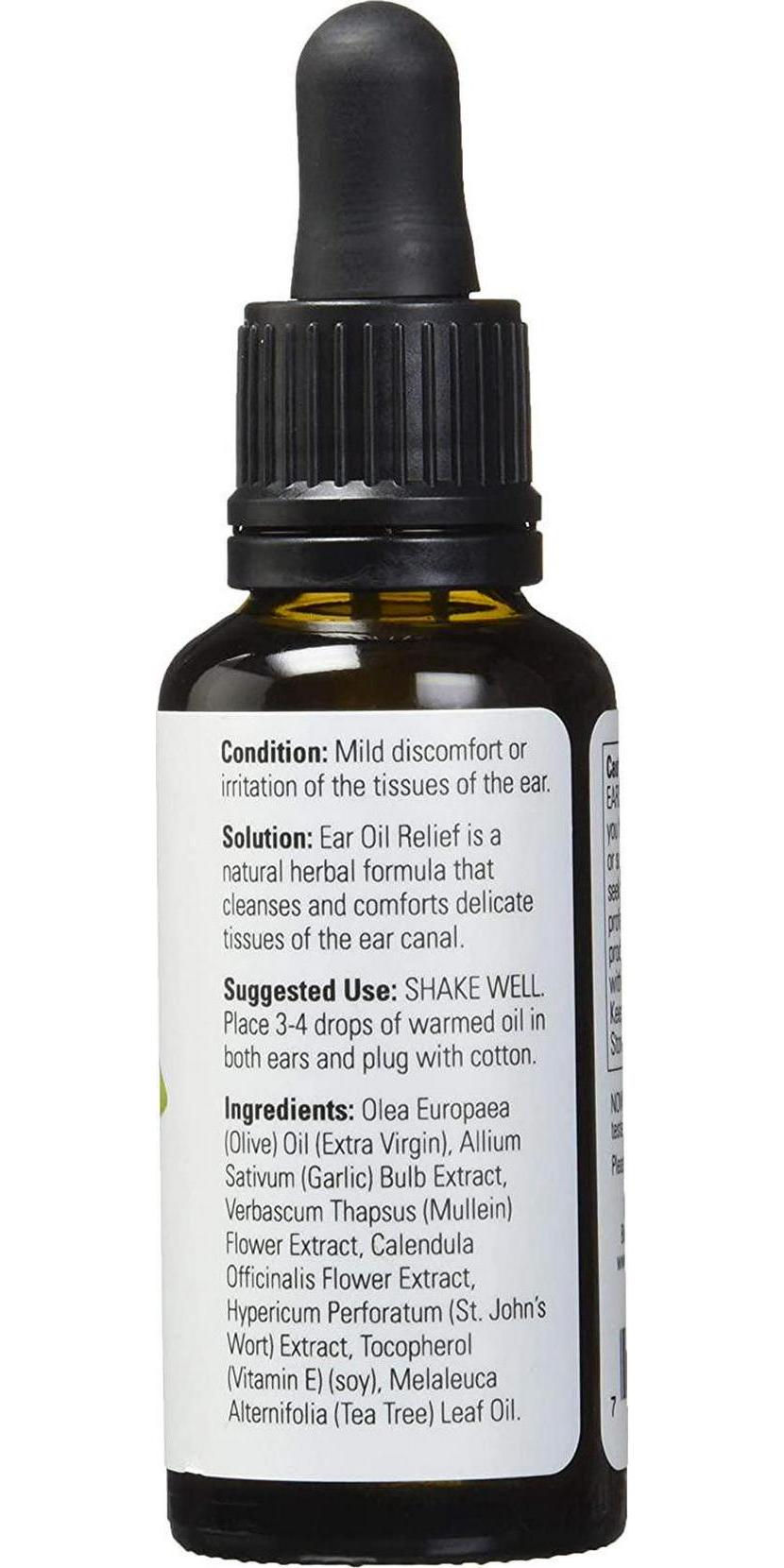 Soothing Blend This natural herbal formula makes it easy to cleanse and comfort the delicate tissues of the ear canal. NOW Ear Oil Relief contains a gentle collection of Garlic, Mullein, Calendula, St. John's Wort, Tea Tree Oil, Vitamin E Oil and Olive Oil. Details Suggested Use: Shake Well. Place 3-4 drops of warmed oil in both ears and plug with cotton. Ingredients: Garlic Bulb (allium sativum), Mullein Flowering Top (Verbascum thapsus), Calendula Flower (Calendula officinalis), St. John's Wort Flowering Top (Melaleuca alternifolia). Additional Ingredients: Vitamin E Oil and Olive Oil. Warning: Do not use if the eardrum is punctured. If you have a medical condition or suspect that one exists, seek the advice of a healthcare professional before using this product. For children's use only with parental supervision. Caution: Keep out of reach
