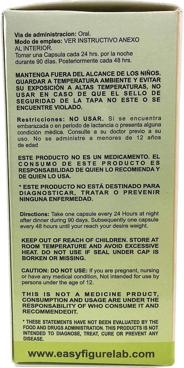 Easy Forte is Easy Figure Lab's perfect Natural Weight Control Formula if you suffer from Constipation, Sluggish Metabolism and Need a Natural Aid to reach your Weight Loss Goals. With just 1 Capsule a day you can aid in digestion, fat metabolizing and to help keep you regular. This pack contains 2 Bottles for 60 Days of Use. ESPANOL - Easy Forte o Figura Reforzado es el suplemento natural perfecto para ayudarte a llegar a tu meta de perdida de peso. Easy Forte de Figura Facil es la formula reocmendada si tienes un metabolismo mas lento y problemas de estrenimiento. Con esta formula puedes digerir mejor, quemar grasa y mantenerte regular.